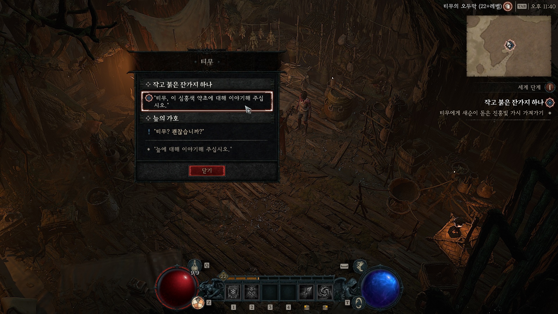 티무에게 심홍색 약초(퀘템은 진홍빛이던데.. 왠만하면 통일 좀 하지..)에 대해 물어보면 설명을 해 준다. 헌데, 당췌 무슨 말인건지...;; 하여튼 완료하면 약초 보관함을 준다.