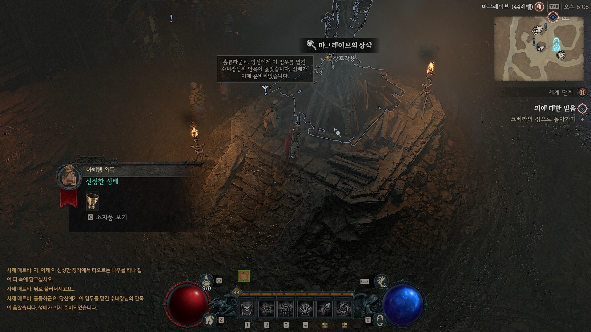 산적을 처치해 성배에 피를 가득 채운 후 다시 돌아와 마그레이의 장작에서 '연기 나는 장례용 장작'을 클릭하게 되면 신성한 성배가 완성된다.
