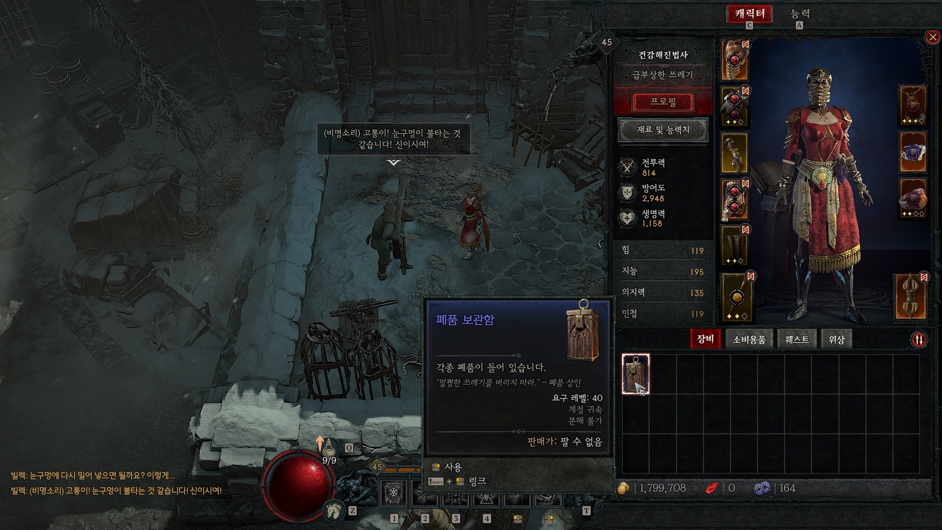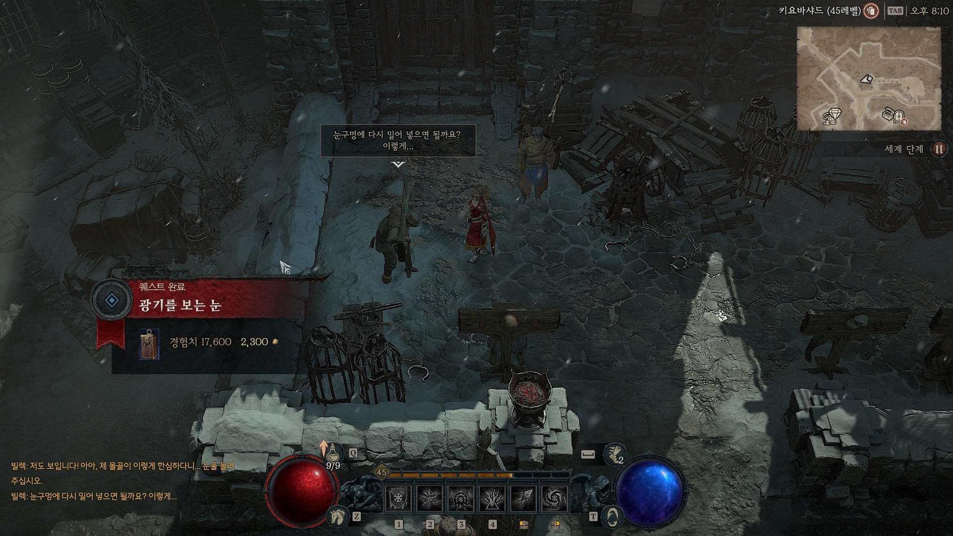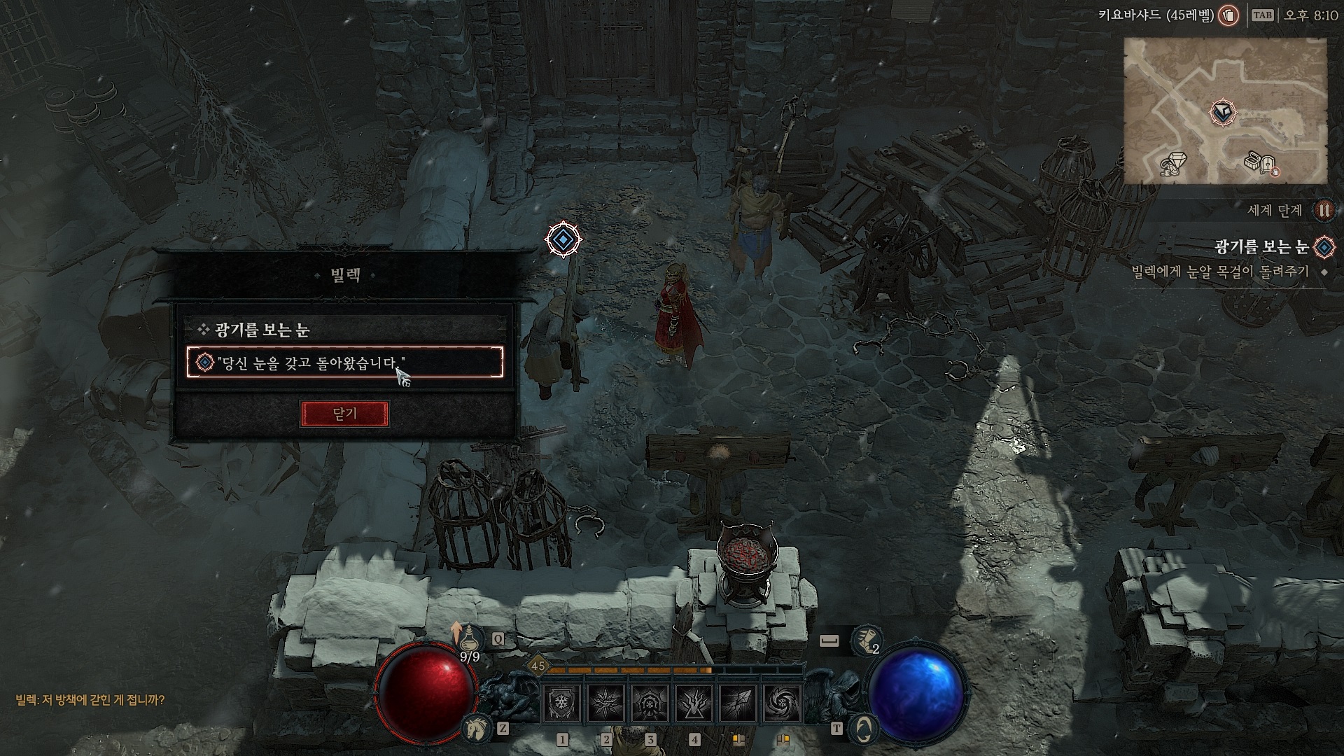 빌렉에게 갖다 주면 퀘스트는 완료되고 보상으로 폐품 보관함을 준다. 계속 서 있으면 빌렉이 자신의 눈을 넣는데...