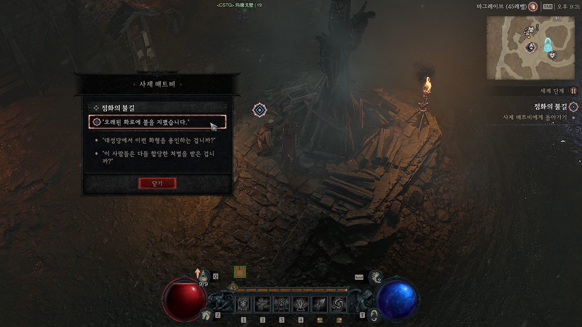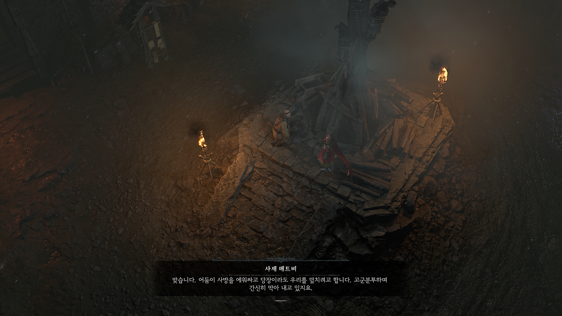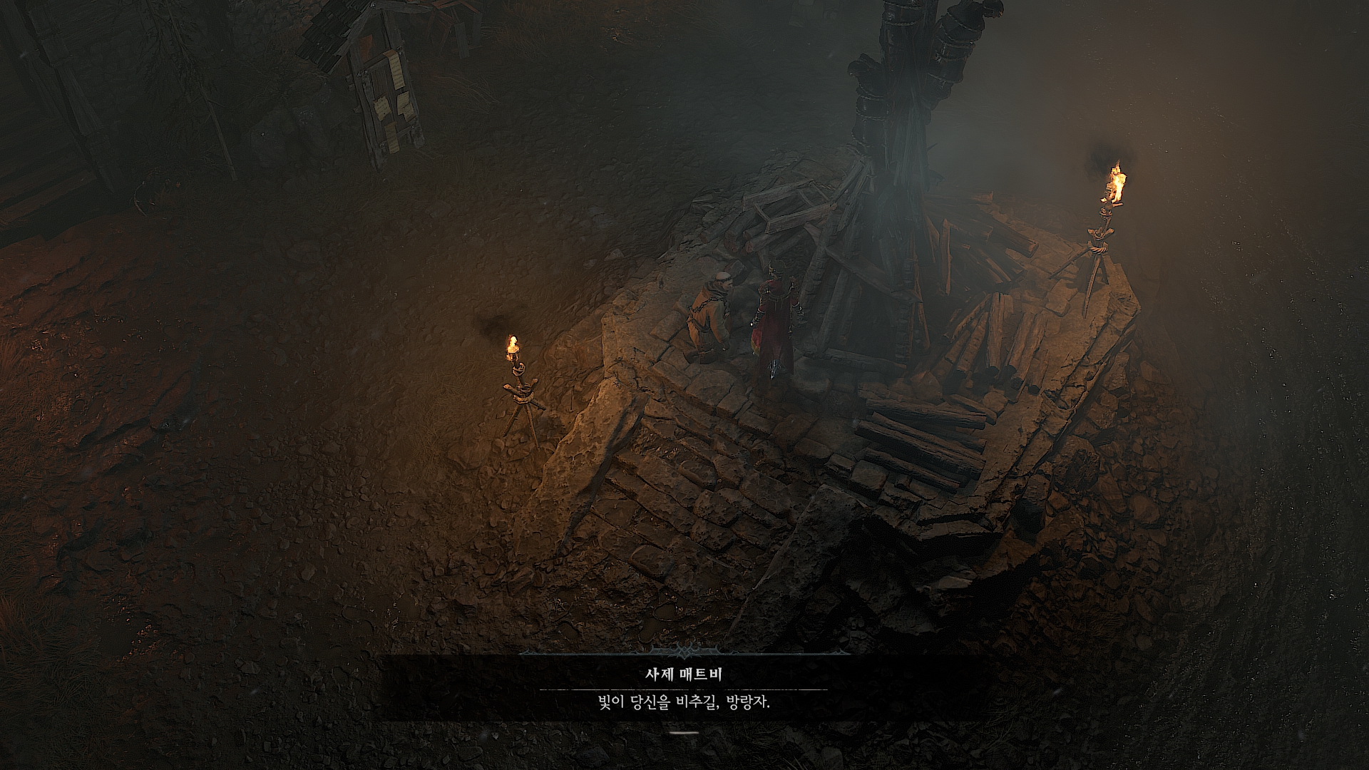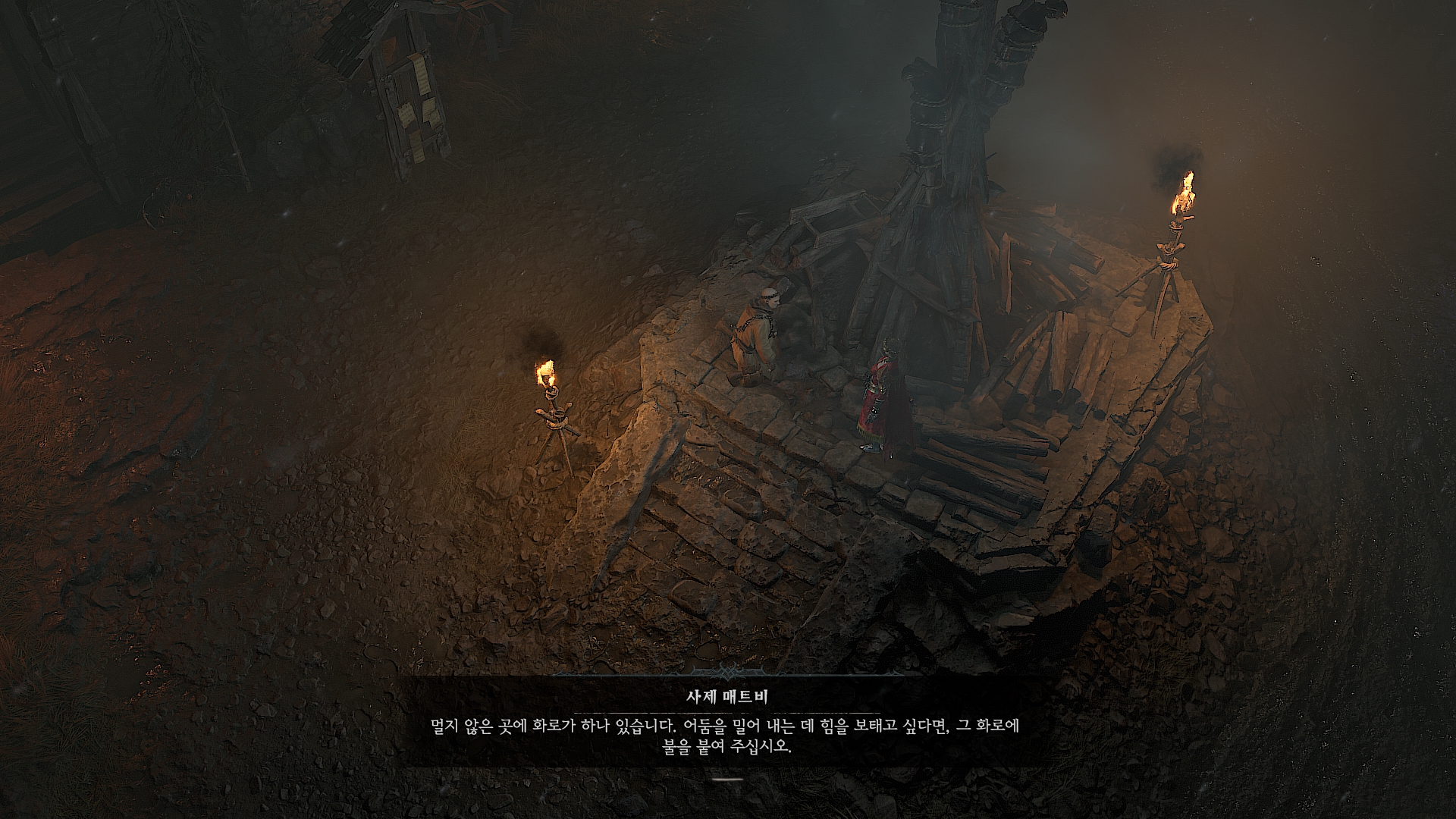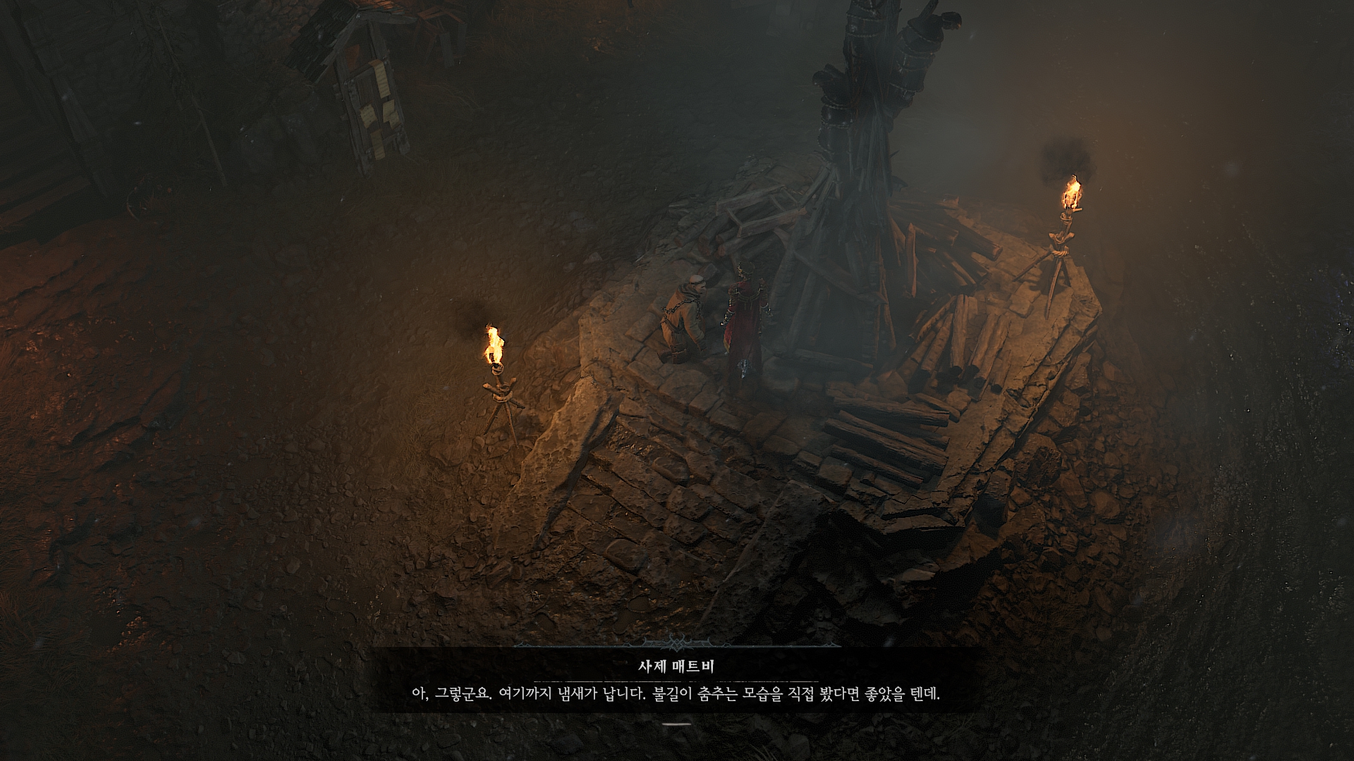 사제 매트비와 대화하면 멀지 않은 곳에 화로가 있으니 불을 붙여 달라고 한다. 화로에 불 하나 붙이기 위험한 곳이라니.. 망한세상을 살아가기란...