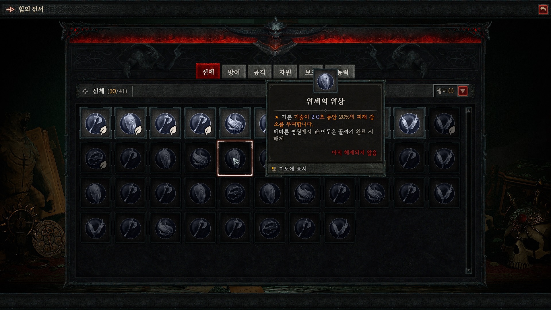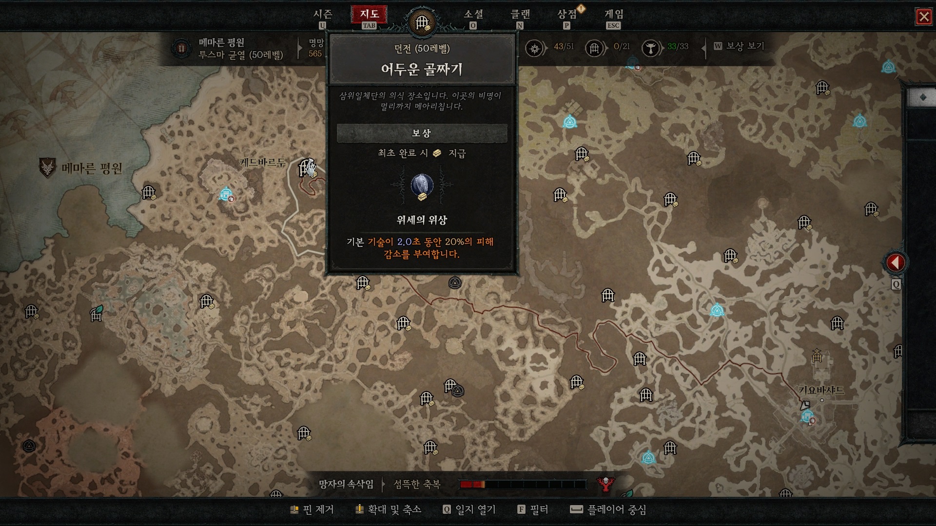 힘의 전서로 가서 우선 해제하지 않은 위상에 마우스를 갖다 대면 위상 설명 밑에 '지도에 표시'란게 있다. 즉, 왼쪽 클릭하면 지도에 핀이 꽂힌다는 것.