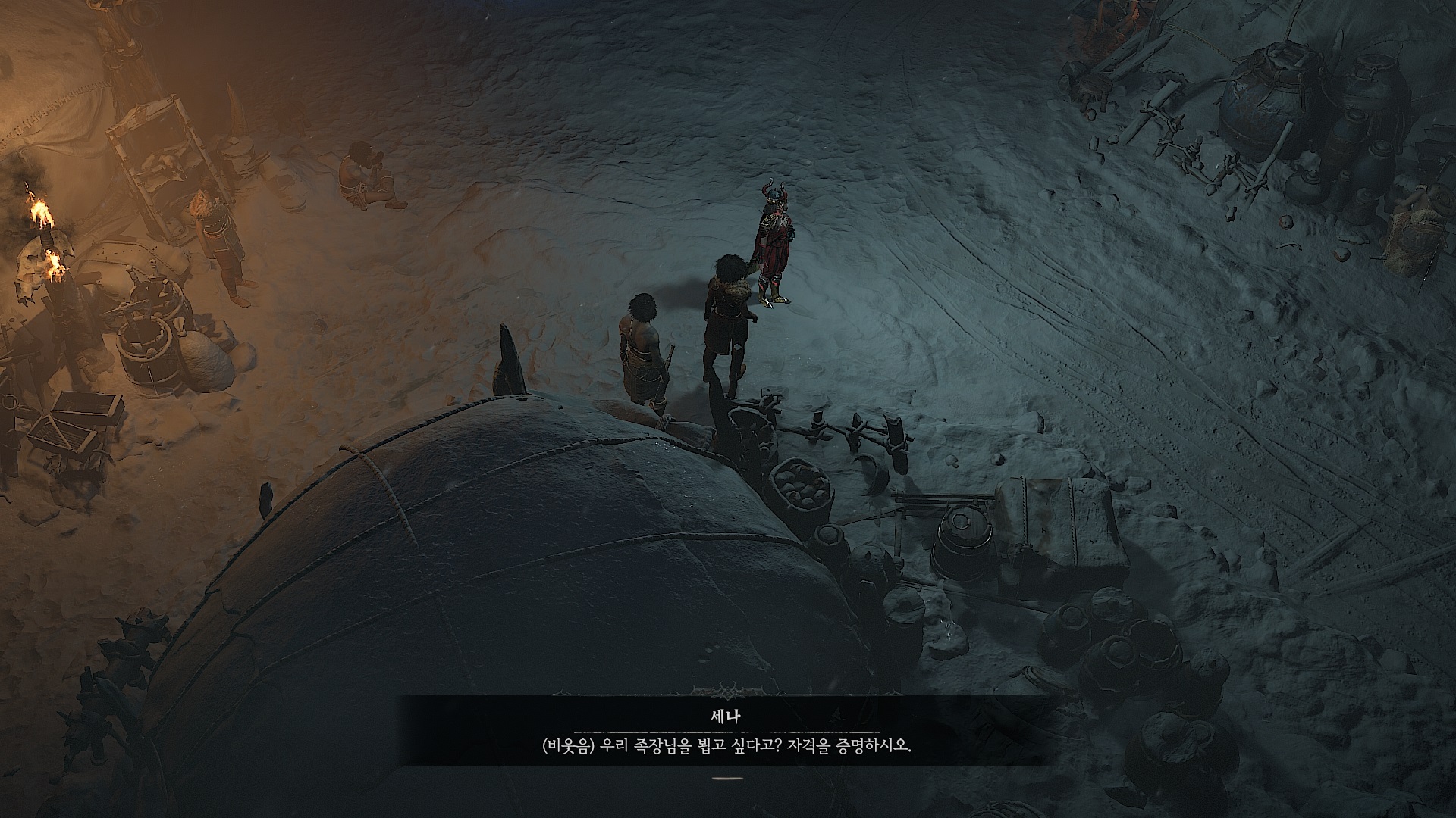 세나에게 족장을 만나고 싶다고 하면 우선 족장에게 인정 받으라고 한다. 얼음혈족 뼈를 가져오라고 한다.