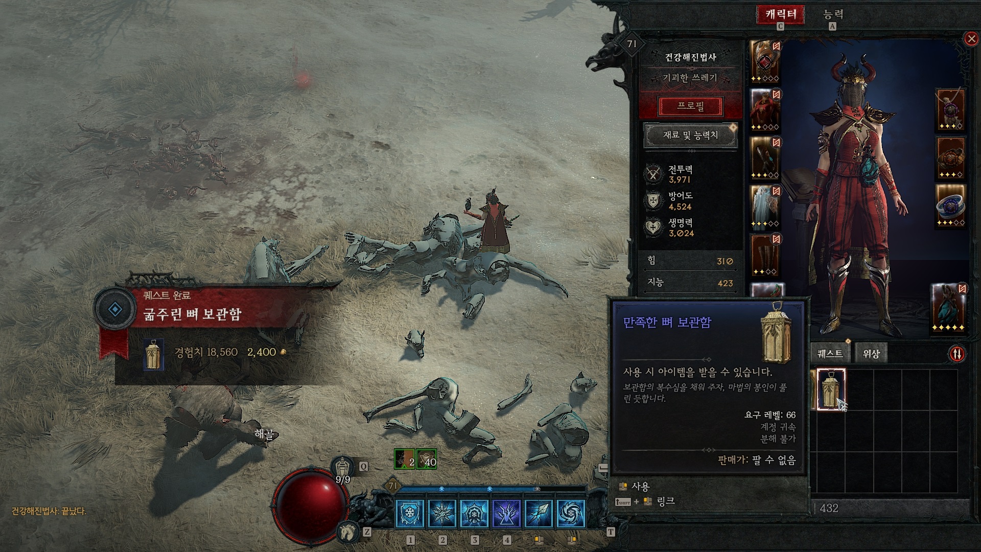 모두 채집하게 되면 만족한 뼈 보관함을 준다. 은화랑 아이템, 보석을 준다.