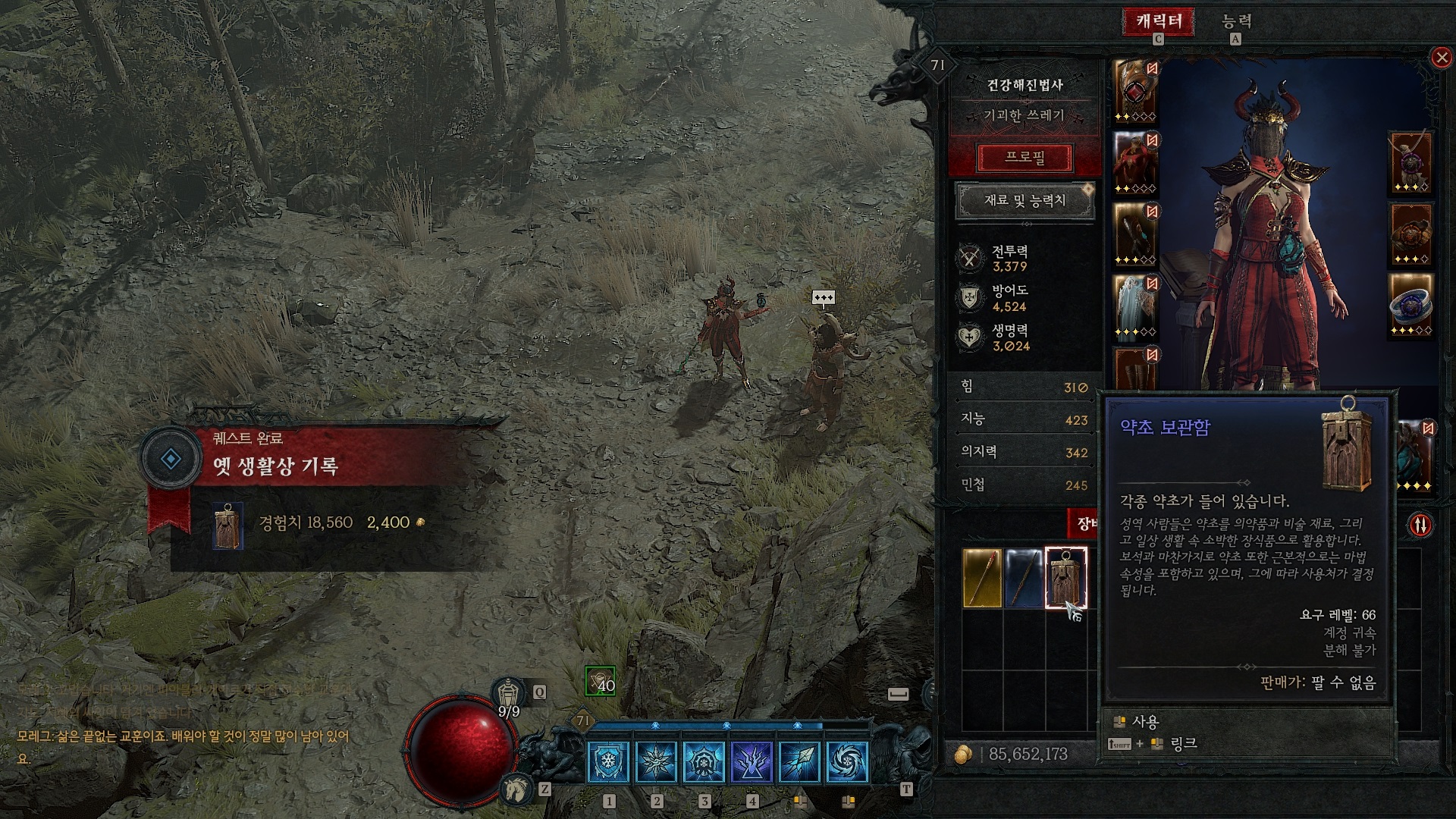 다 모았다면 다시 모레그에게 돌아가 대화를 하면 퀘스트 완료. 보상으로 약초 보관함을 준다.