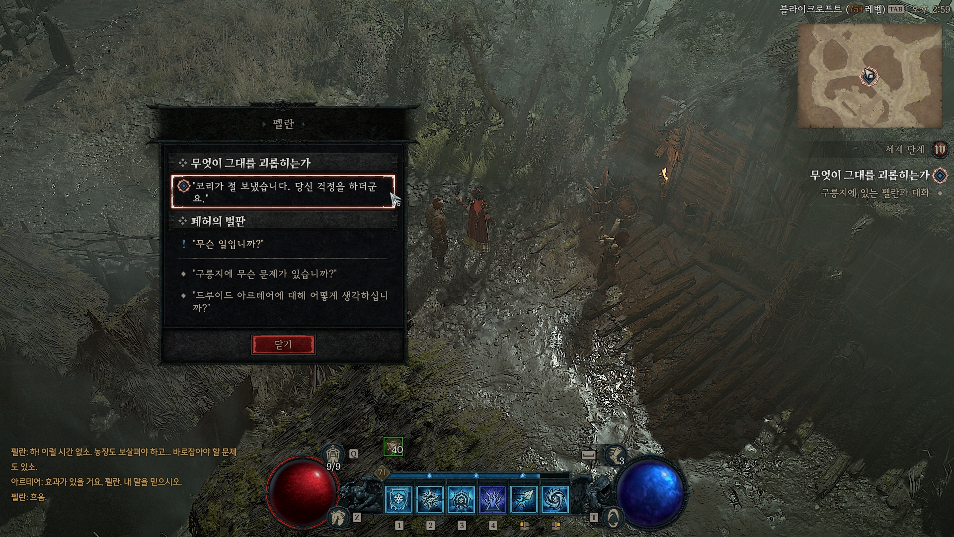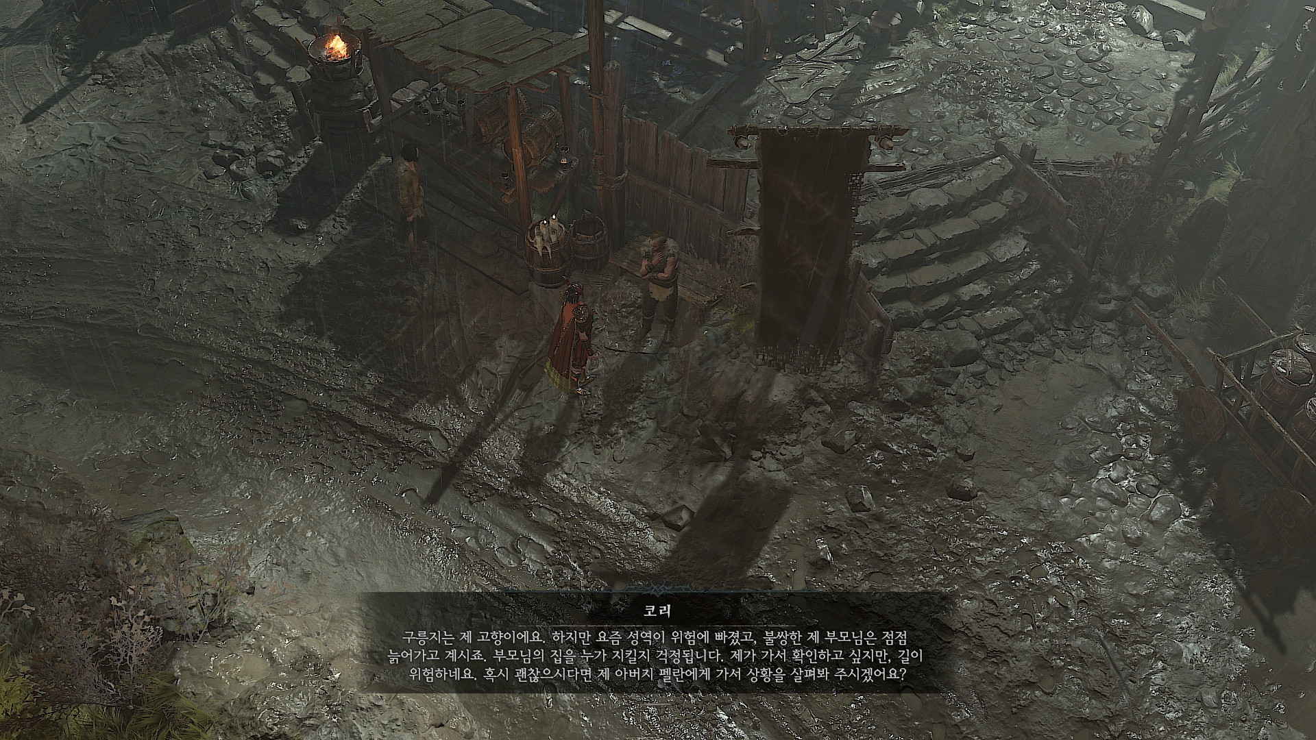 코리에게 왜 여기 있는가 물어보면 부모님이 걱정된다면서 자신의 아버지 펠란의 상황이 어떤지 살펴봐 달라고 한다.