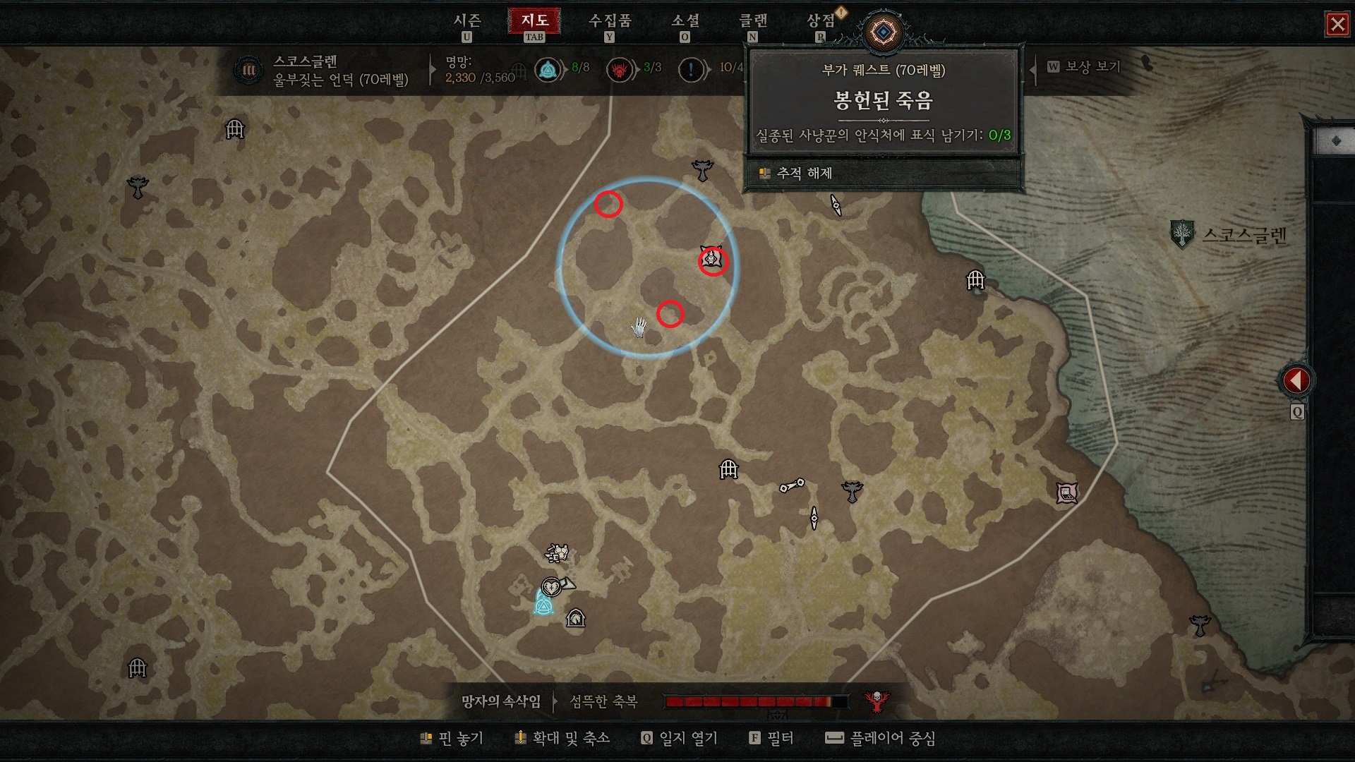 빨간원으로 표시된 곳으로 가면 사냥꾼 시체가 있고 장례의 결계 만들기가 있다. 결계를 만들면 몹들이 덤벼든다. 모두 안식을 줬다면 어디선가 목소리가 들려온다.