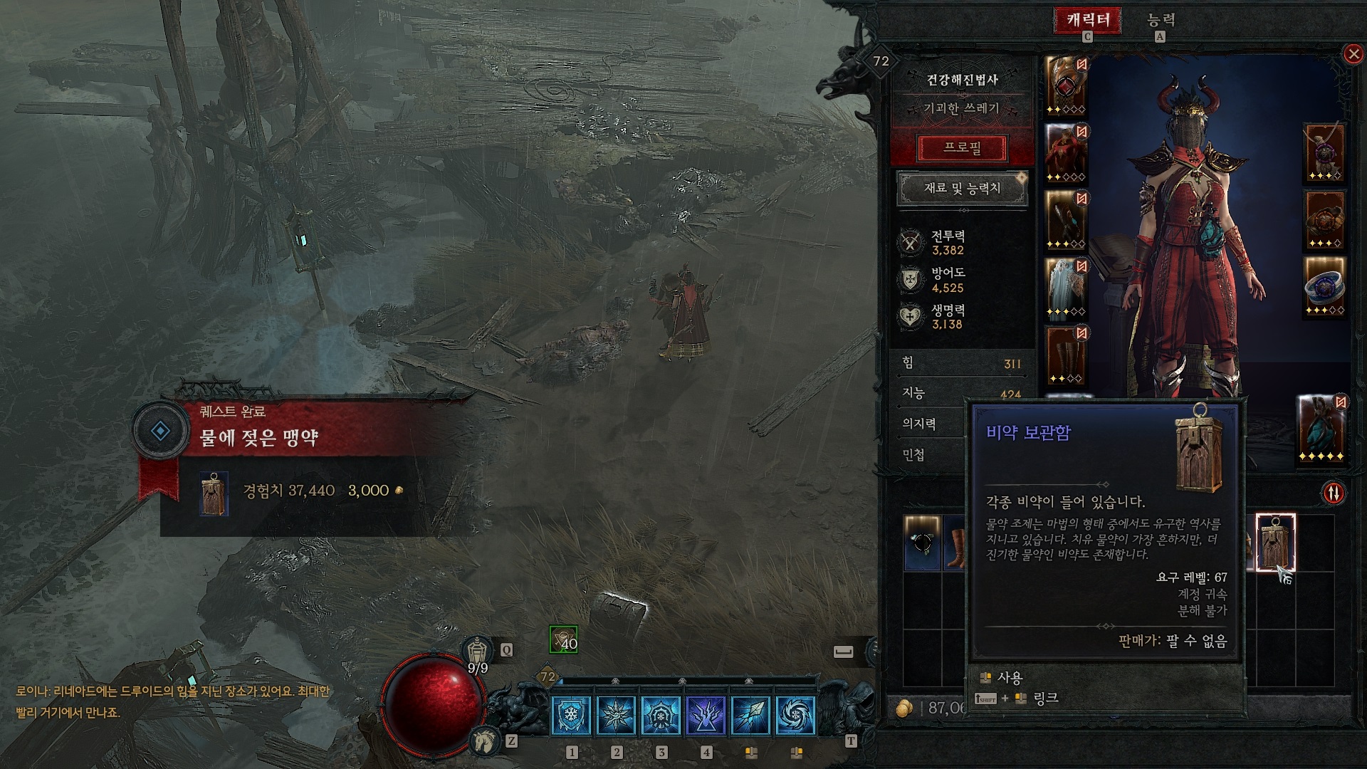 아는 사람인가 물어보지만 확인 할 수 없을 정도로 부패해 있다. 의식을 위해 드루이드 리네아드의 힘을 지닌 장소로 오라고 하면서 퀘스트가 완료되고 비약 보관함을 보상으로 준다. 얽힌 진실 풀어내기 퀘스트로 이어지게 된다.