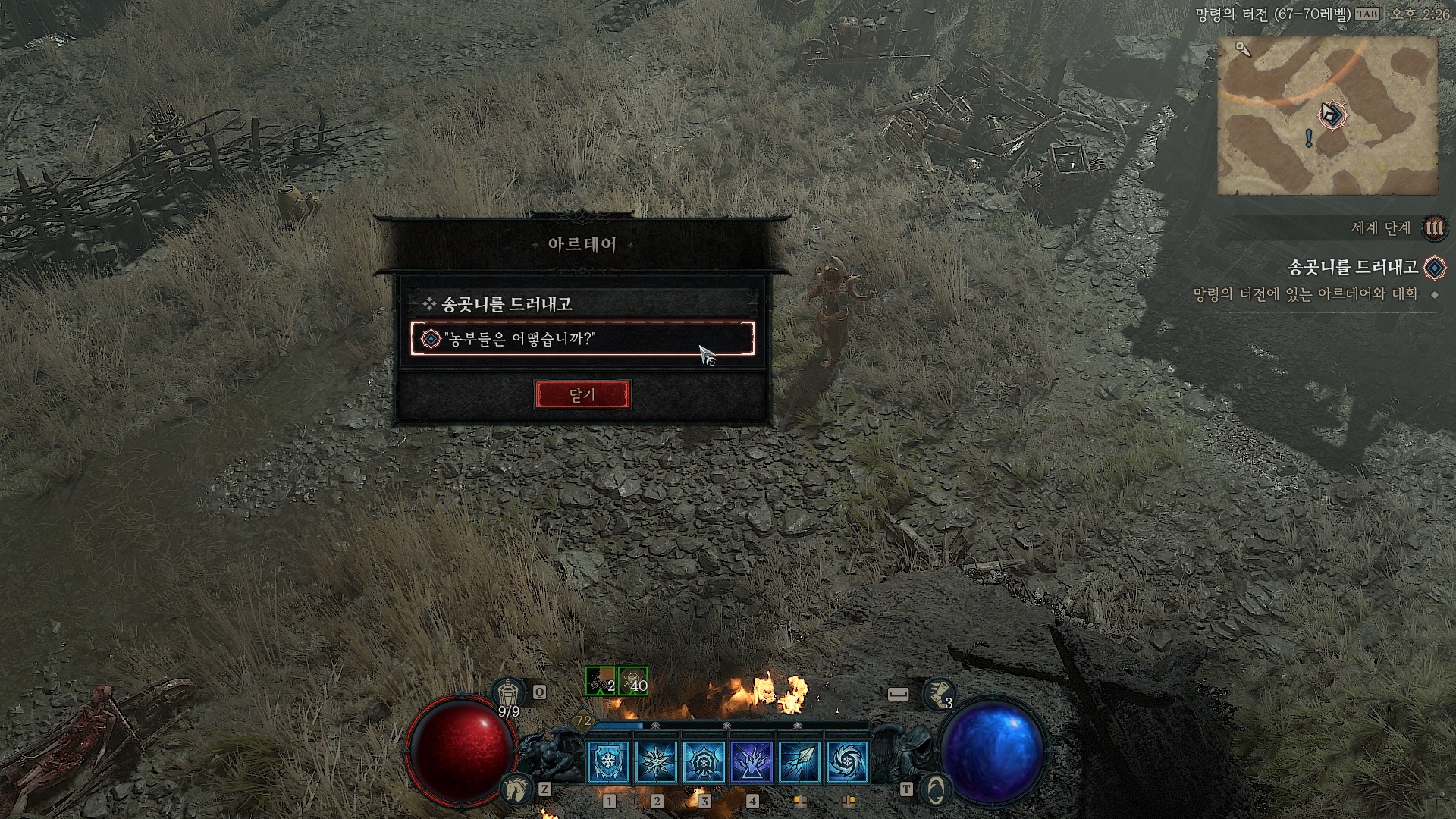 우나를 처치하고 난 후 아르테어와 대화하면 농부들의 상태를 보기 위해 망령의 터전으로 오라고 한다.