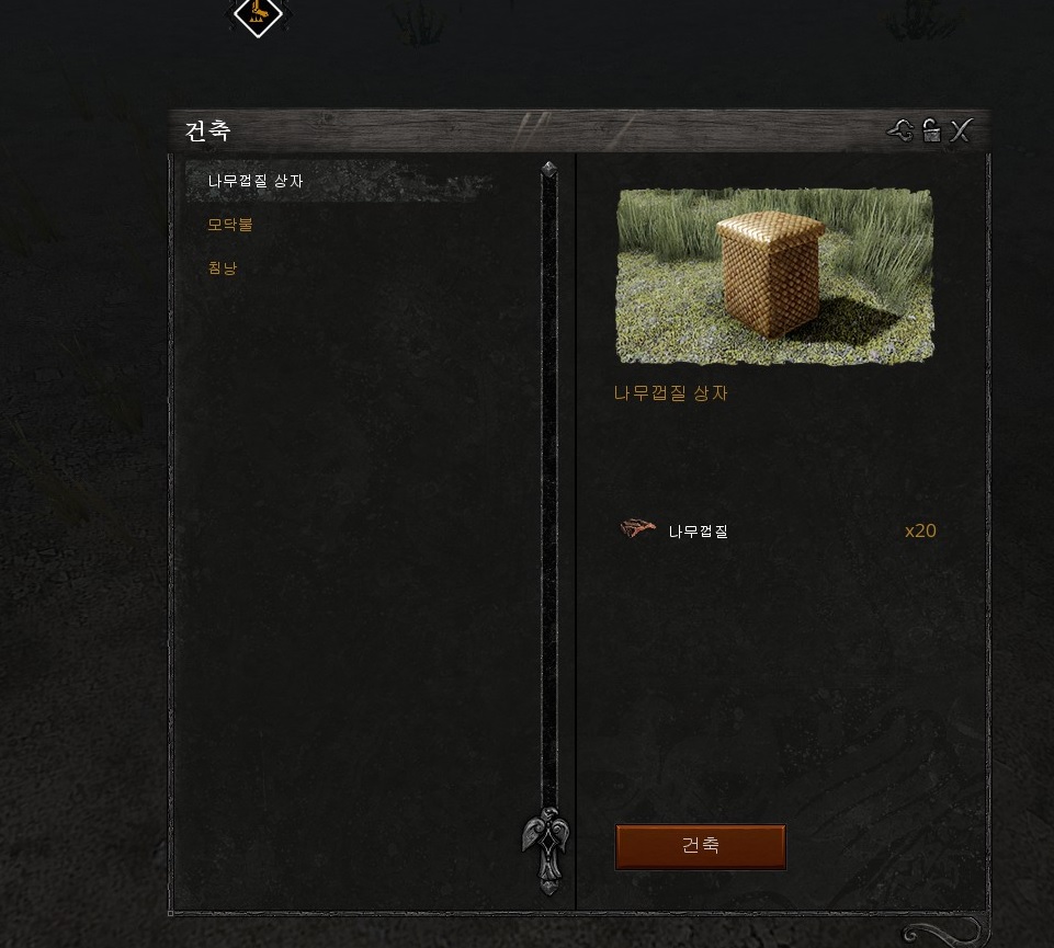 이제서야 재료를 넣는 창이 나온다. 가방을 열어(I 키) 필요한 재료를 Ctrl + 마우스 좌클릭하거나 끌어서 넣으면 된다. 그리고 최종적으로 '건축'을 눌러주자.