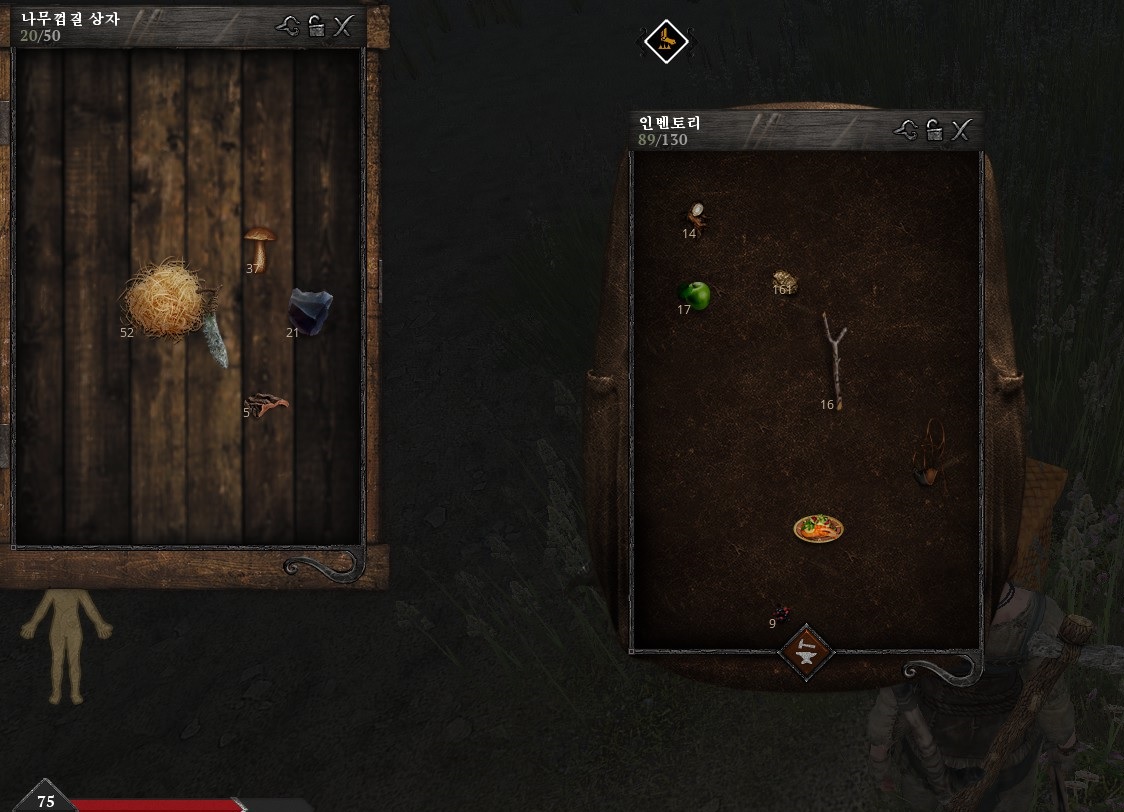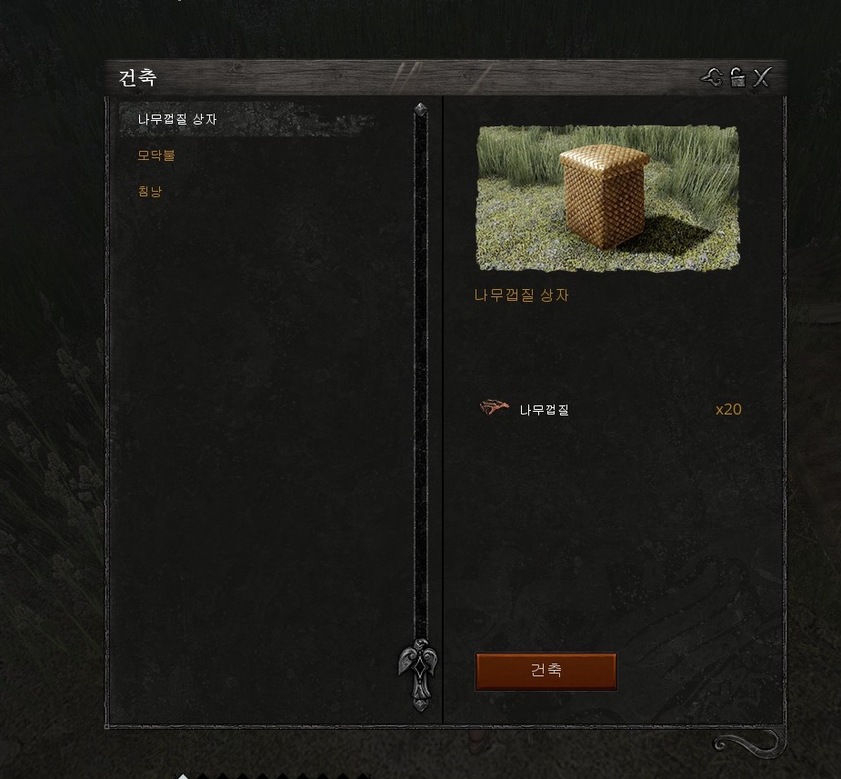 나무껍질 상자를 건설 한 후, 우클릭 -> 열기를 하면 이렇게 아이템을 보관 할 수 있다. 보관함의 종류에 따라 넣을 수 있는 것이 다르다. 나무껍질 상자를 예로 들면 작은 아이템, 돌이나 딸기, 돌, 섬유 등은 넣을 수 있지만 나무 판자와 같이 크기가 큰 것은 아예 넣질 못한다.