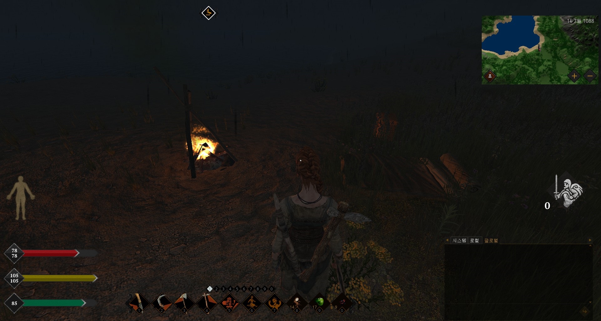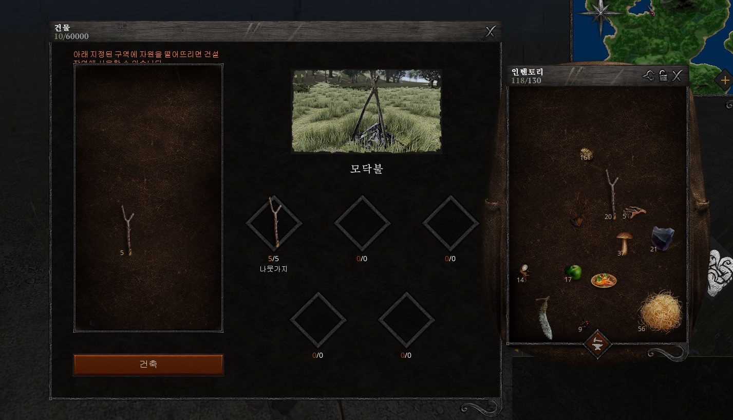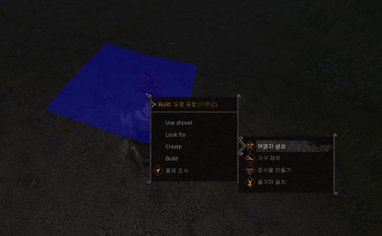 당장 집을 지을 수 있긴 하나 그건 따로 적기로 하고 가장 간단하게 건설이 가능한 야영지 건설로 어떻게 하는지에 대해 알아볼까 한다.