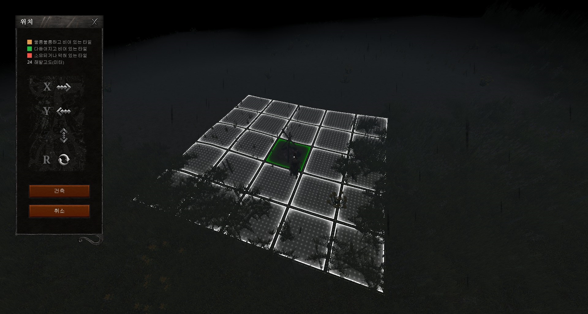 모닥불을 선택하고 '건축'을 클릭하면 이런 화면이 나온다. 휠로 확대/축소가 가능하다. 왼쪽 위치에 대해선 침낭을 만들때 따로 설명하겠다. 우선은 해당 위치에 바로 지을 예정이니 일단 왼쪽 메뉴의 '건축'을 다시 눌러보자.