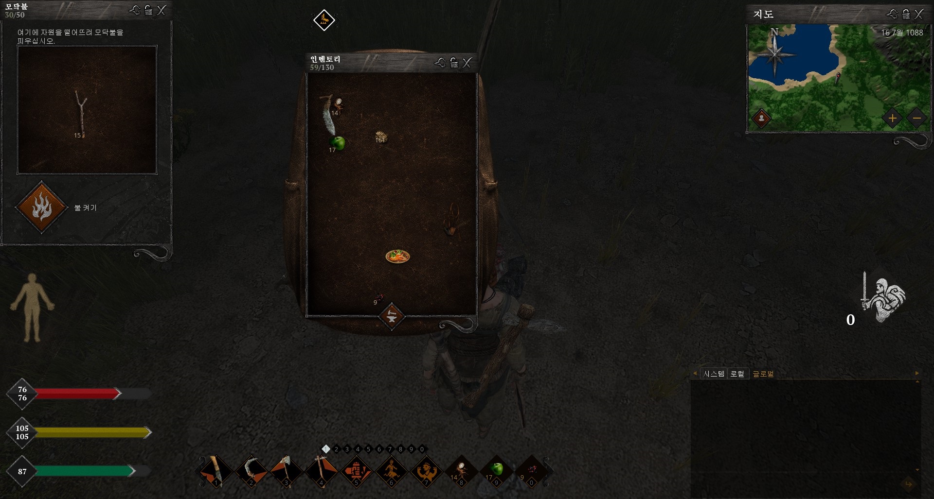모닥불 -> 마우스 우클릭 -> 땔감 추가 후에 땔감을 넣자. 나뭇가지의 경우 4개부터 불이 붙는다.