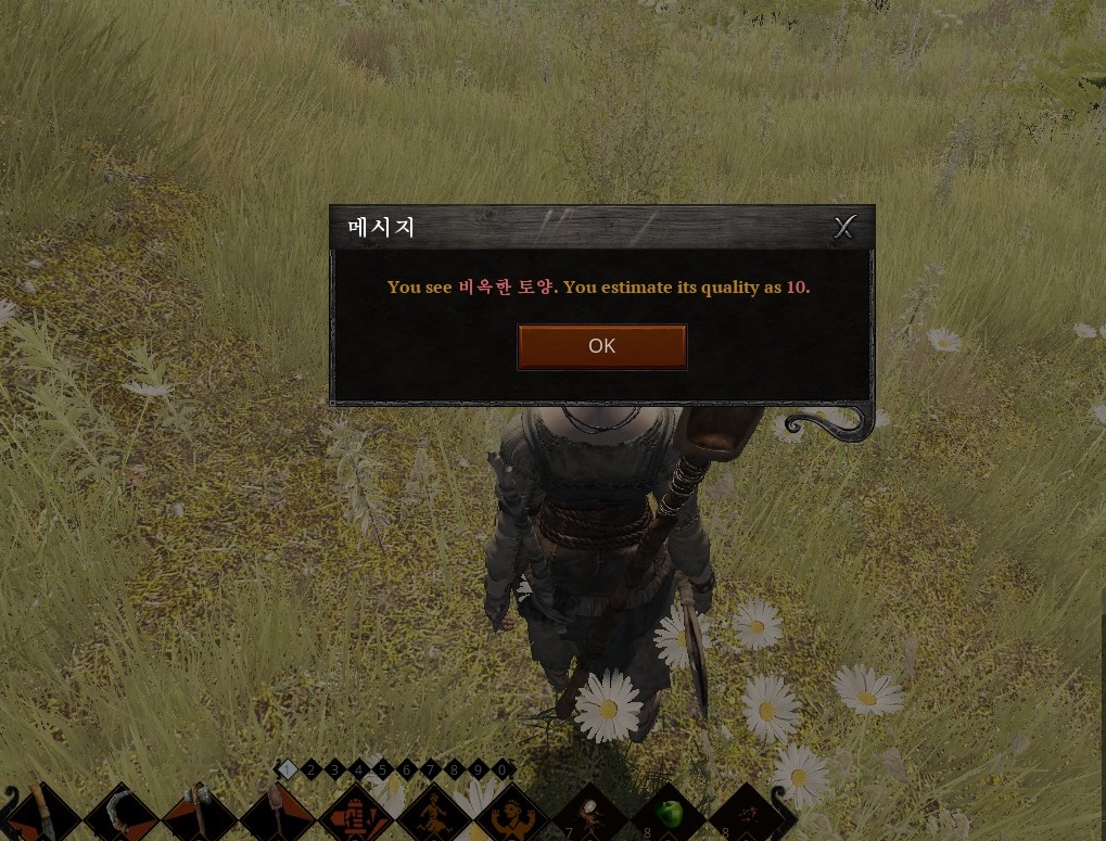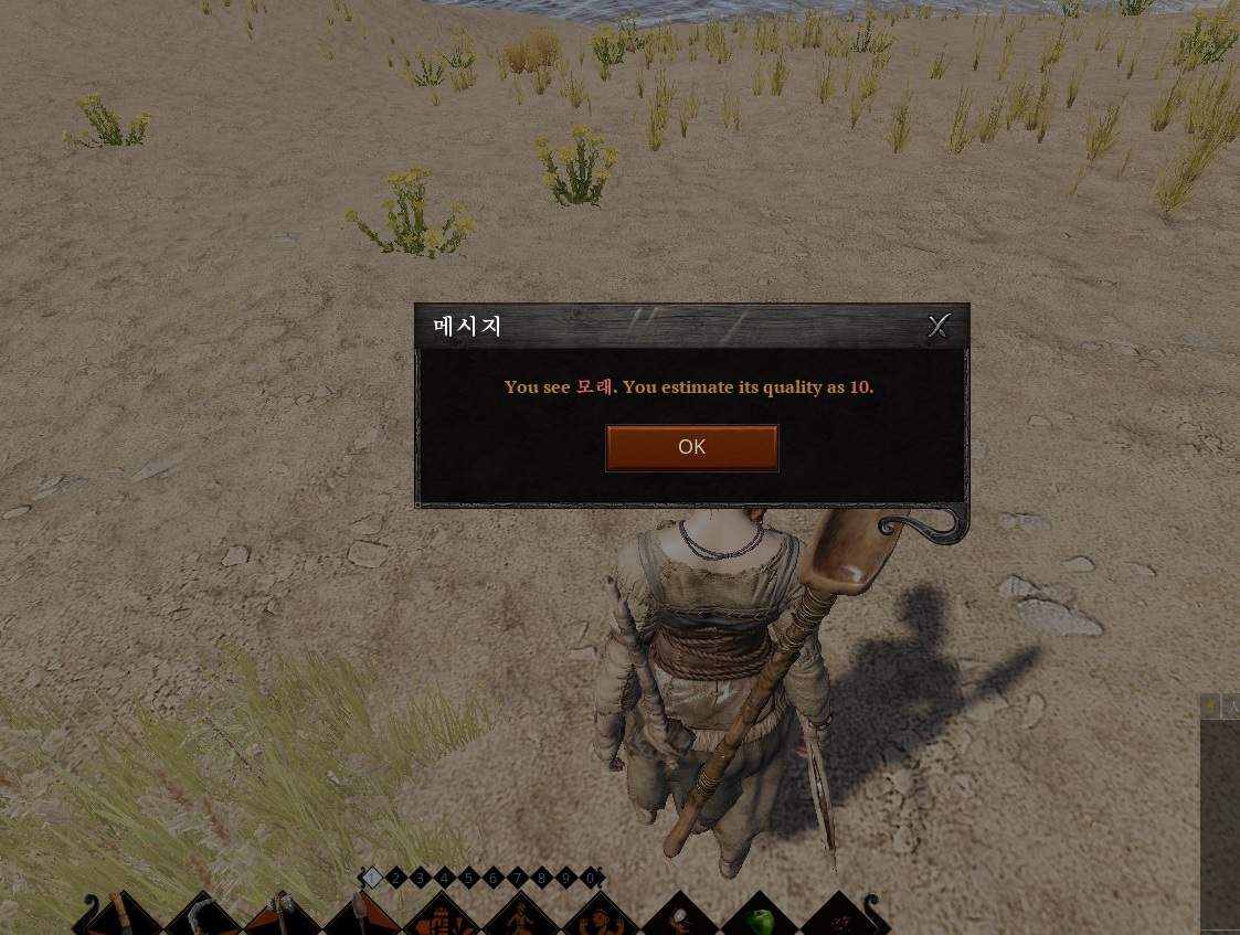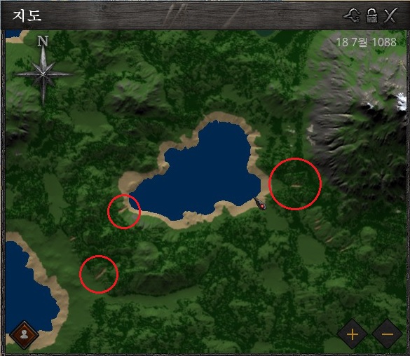 M 키를 눌러 미니맵을 보면 저렇게 뭔가 깎여 나간 듯한게 보인다. 저기 가면 점토가 있다. 일단 발견한 것 중에서 품질이 높은 것은 호숫가의 왼쪽과 바로 붙어 있는 곳이다. 품질 50짜리 점토가 있더라..