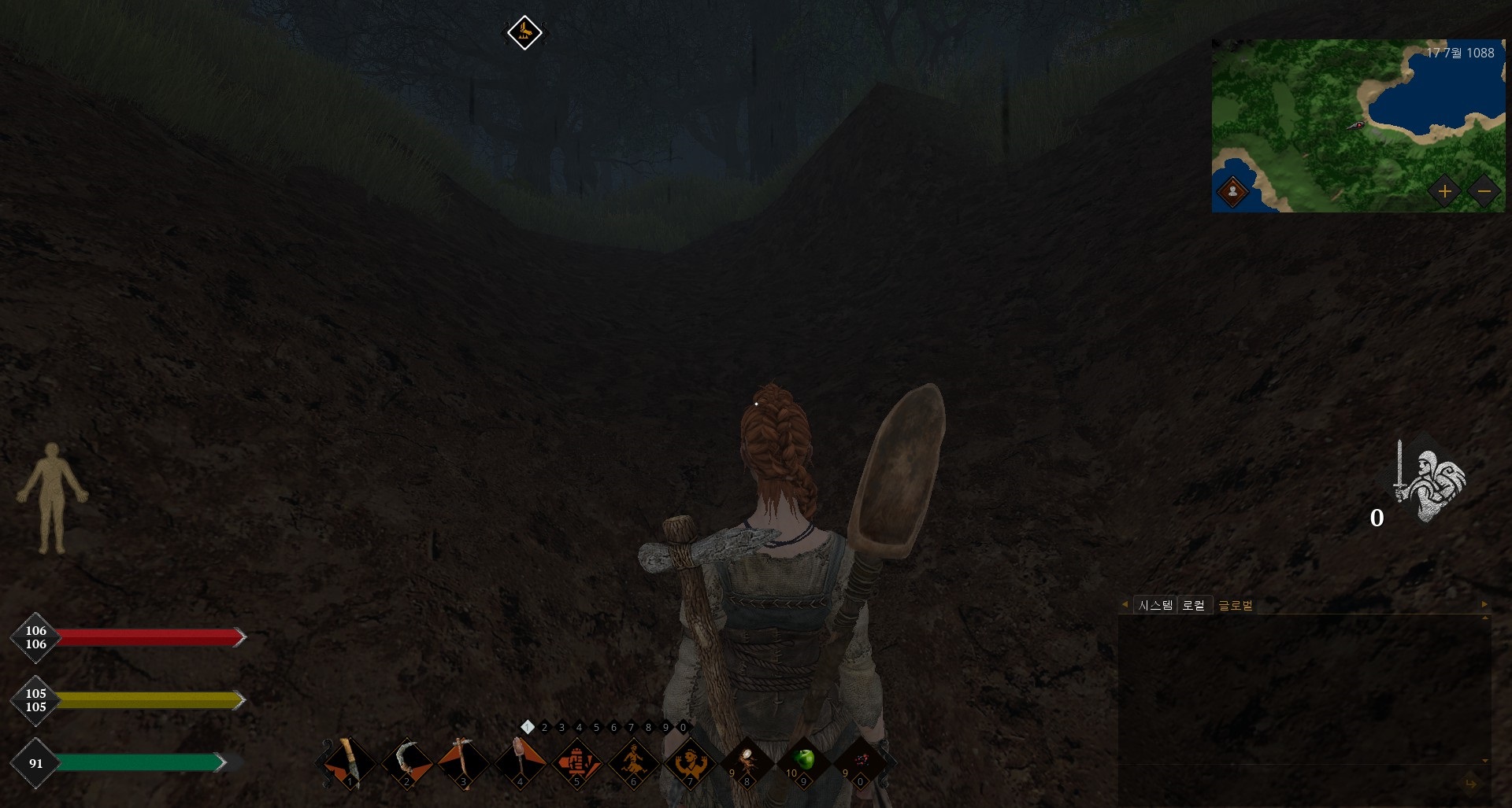 처음 짓게 되는 회반죽 오두막에 점토가 들어가는데 점토는 보통 이렇게 생긴 지형에서 채집이 가능하다. 지면 낮추기 하면 자연적으로 들어온다. 좀 더 쉽게 미니맵을 보면서 찾을 수가 있다.
