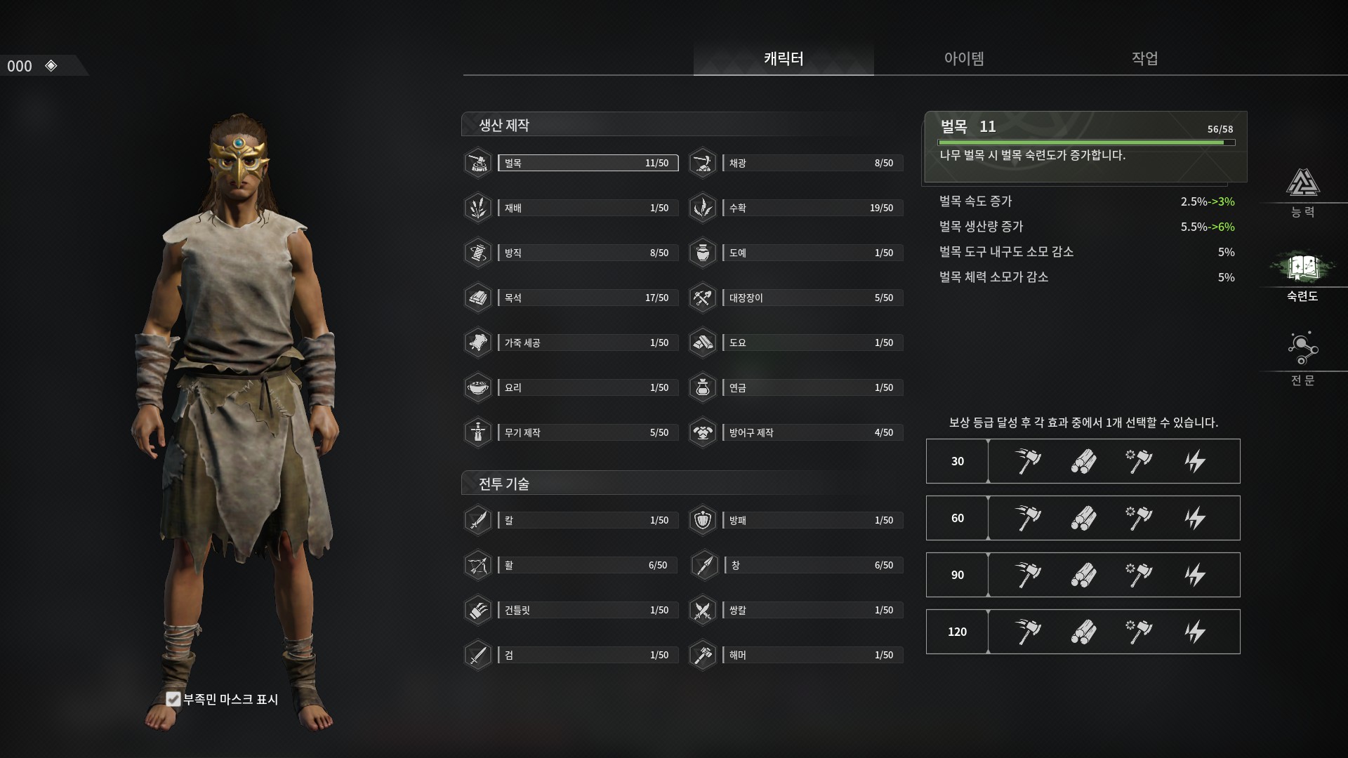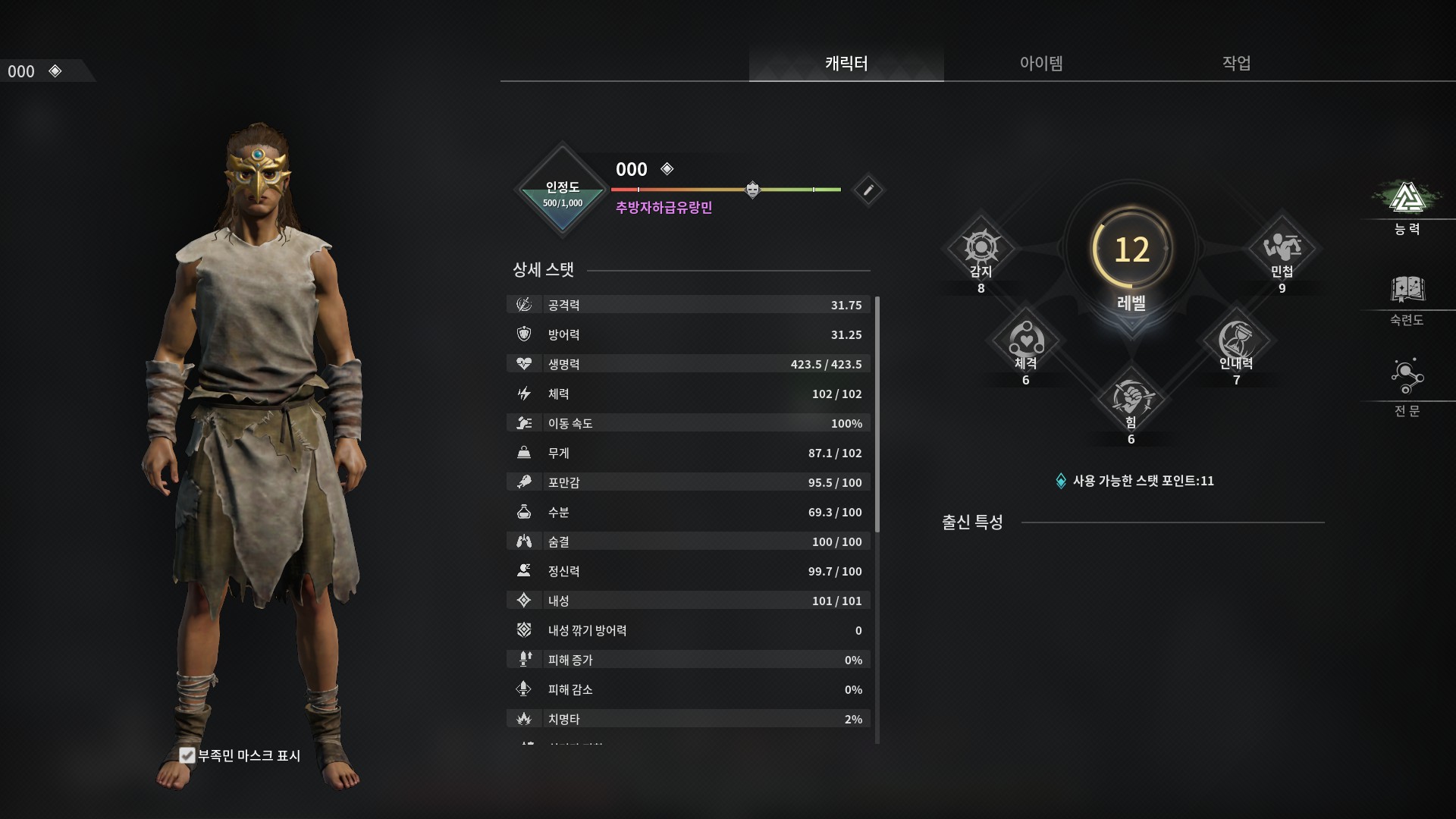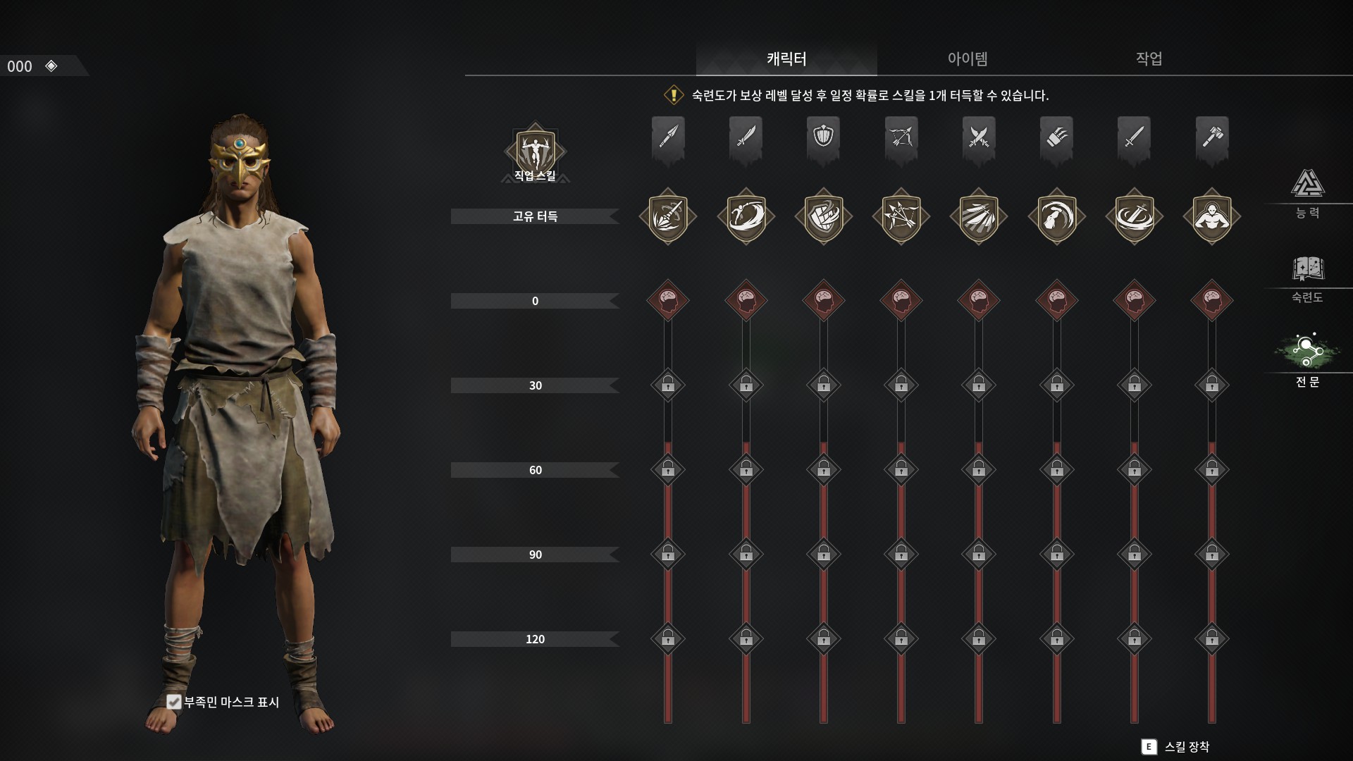 캐릭터와 관련된 메뉴로 상당히 세분화 되어 있다. 캐릭터 기본 능력과 숙련도 시스템, 그리고 무기를 사용하게 되면 그에 따라 숙련도가 오르고 기술을 개방하는 방식이다. 노가다 좋아하는 사람들에겐 엄청난 노동을 안겨줄 것 같다.