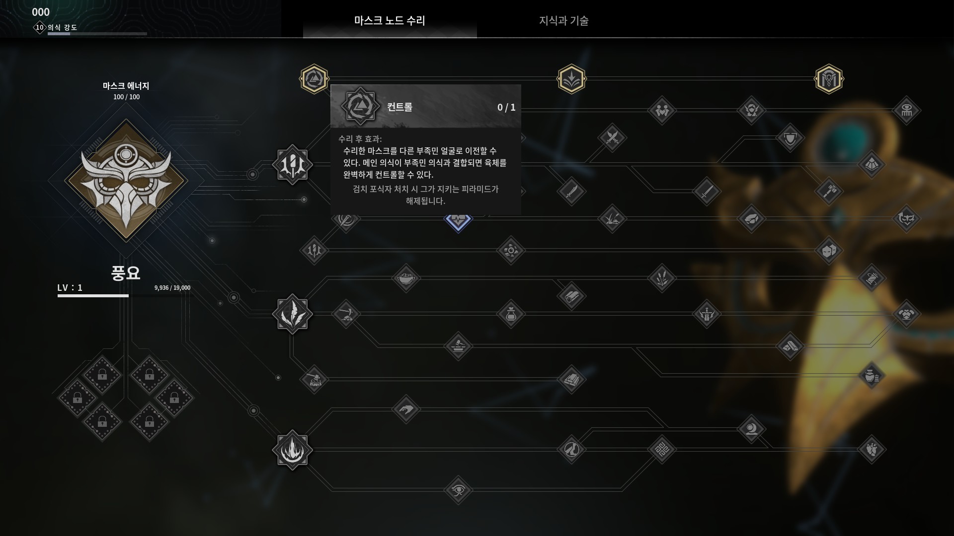 이 게임의 가장 큰 특징은 바로 요 마스크.. 마스크를 수리해서 뭔가 힘을 개방한다는 것 같다. 여타 RPG 게임에서 스킬 트리라고 보면 될듯 싶다. 제일 위에 줄을 보니 개방 할려면 뭔가를 처치해야 되는걸로 봐선 아마 던전 비슷한곳에 한번이상은 들어가야 되지 싶다.