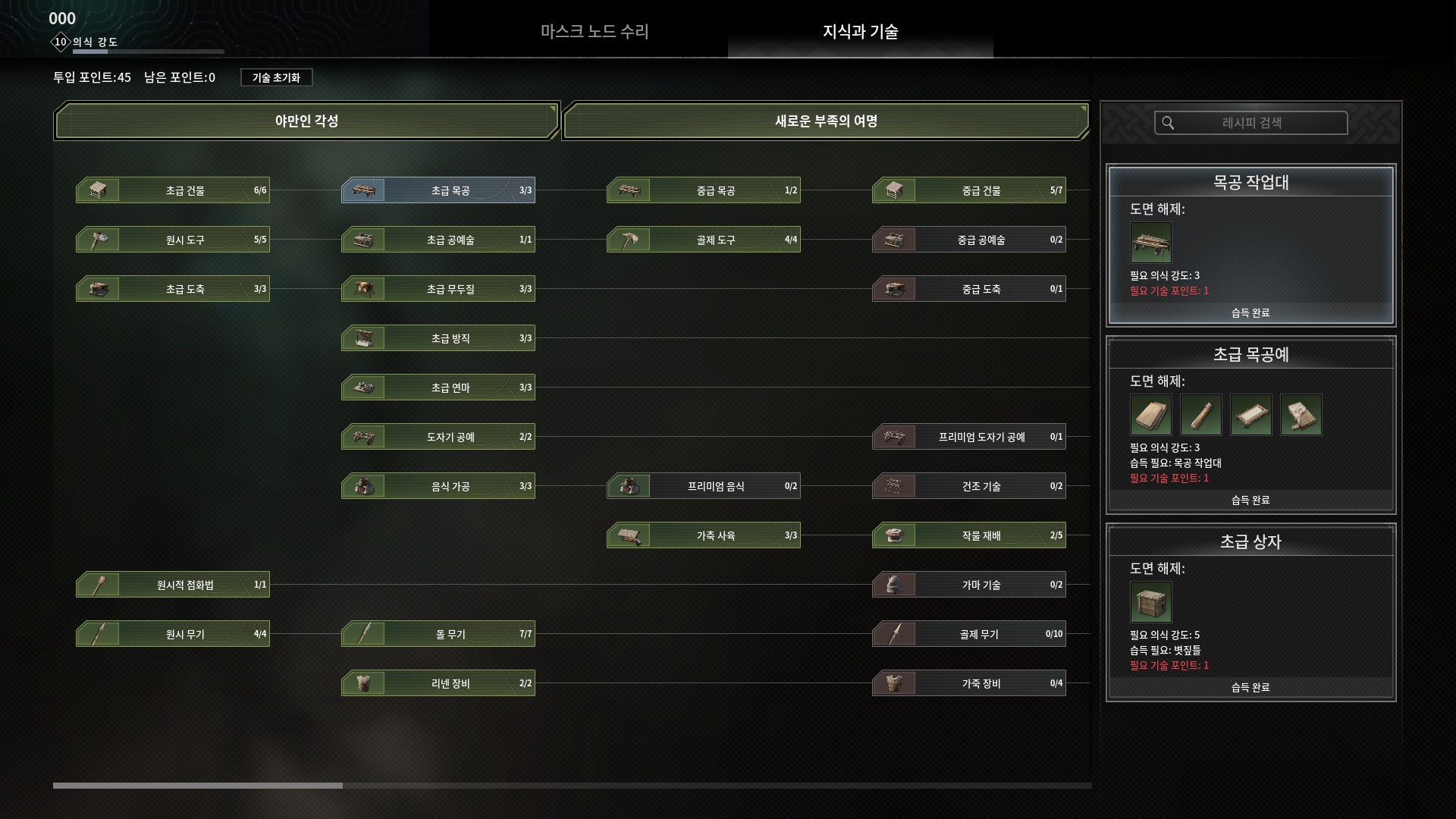 다음은 생존에 필요한 도구나 건물 등을 개방하는 것으로 여기선 의식 강도와 기술 포인트가 필요하다. 의식 강도는 각종 활동으로 올라가면서 렙업하게 되고 그에 따라 포인트를 주는 형식. 노가다로 간단하게 올라갈 수 있을듯..