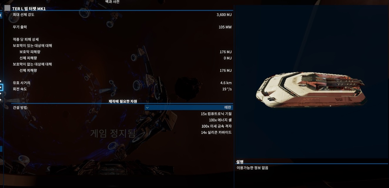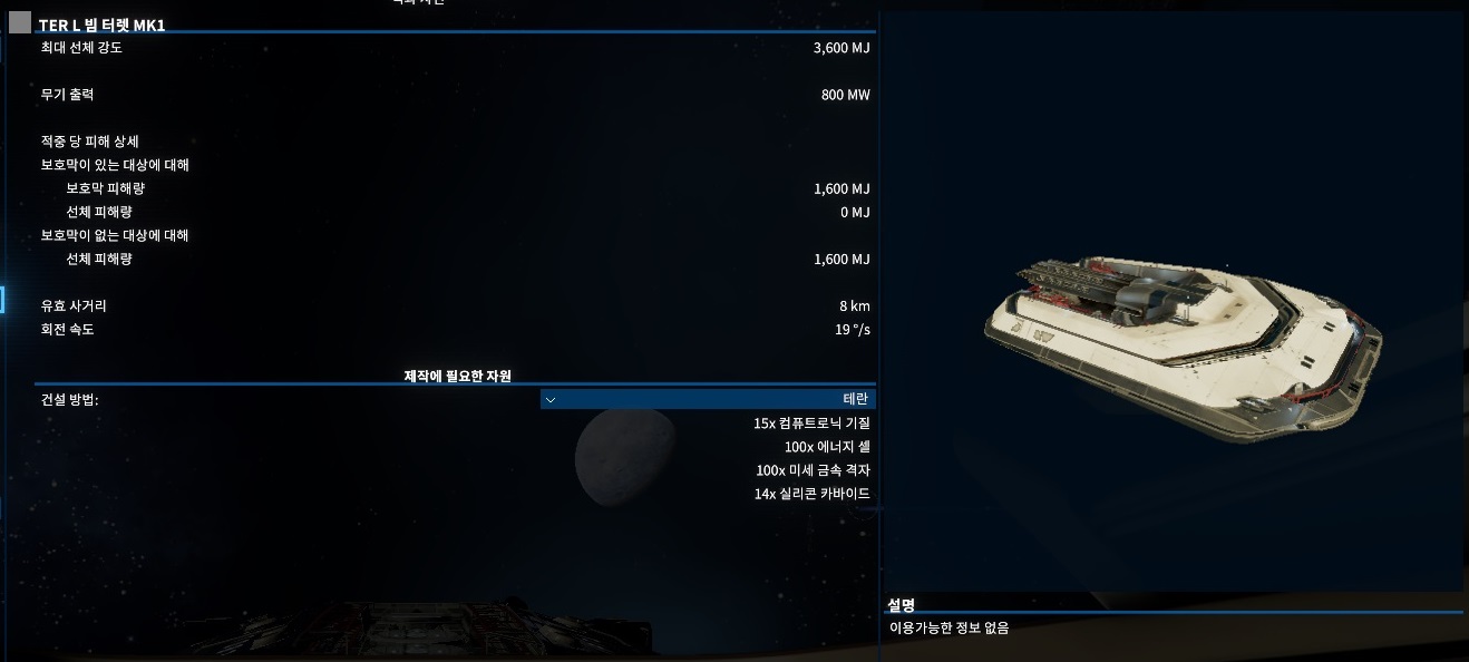 수정전의 테란 L 빔 터렛. 출력은 105MW, 선체랑 보호막 피해는 176MJ, 사거리는 4.5Km이다.