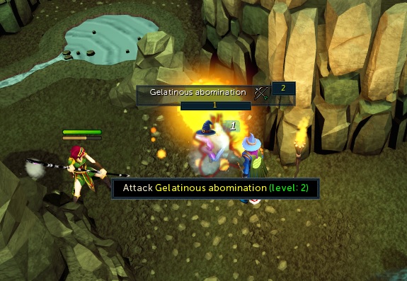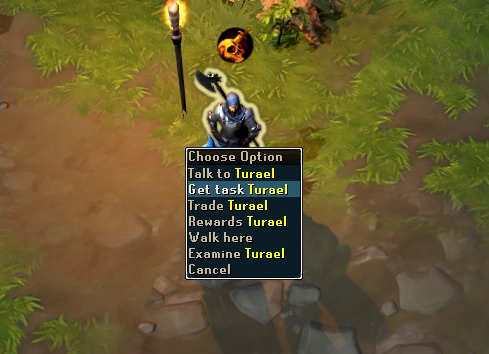 spiked gauntlet을 장착 한 후 Turael 우클릭, get task turael을 선택하자. Activated Enchanted Gem이란 아이템이 생긴다. 앞으로 turael에게 task를 받으면 여기에 표시된다. 이걸 완료하면 slayer 스킬 레벨이 올라간다. 그러면 gelatinous abominations 5마리를 처치하라고 하면서 동굴 위치를 알려준다.