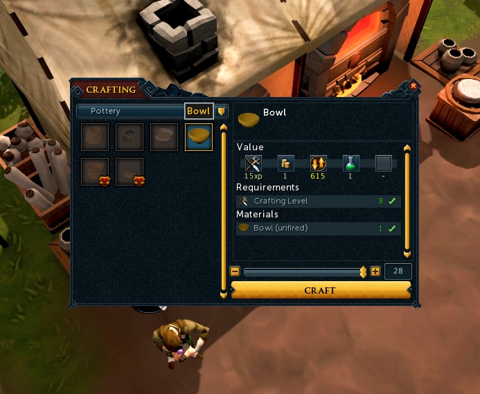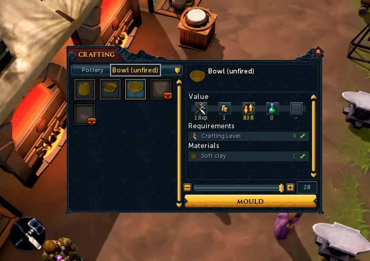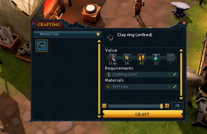 점토 반지(clay ring)을 만드는데 이게 제작 속도가 빠르다. 이걸 굽게 되면 경험치를 더 주긴 하지만 시간이 걸린다. 그러니 그냥 버리거나 아니면 팔아버리고 다시 점토를 캐서 무른 점토 만들고 점토 반지 만들기를 반복한다.
