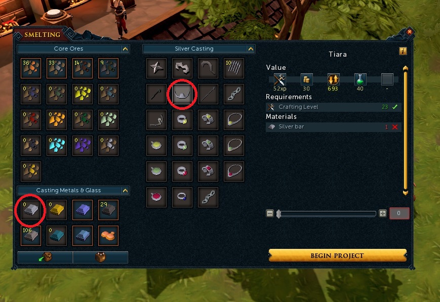 우선 결속 되지 않은 티아라를 하나 만들어야 된다. 재료는 은괴가 들어가는데 Burthorpe 광산에서 은광석이 나오니 그걸로 은괴를 만들고, Casting Metals & Glass 에서 은괴 선택 후 티아라를 선택하고 하나 만든다.