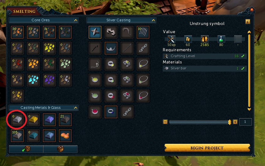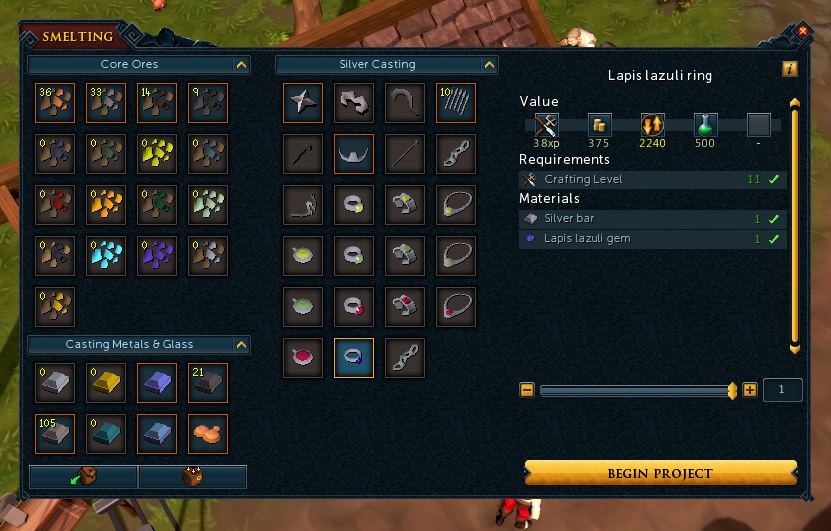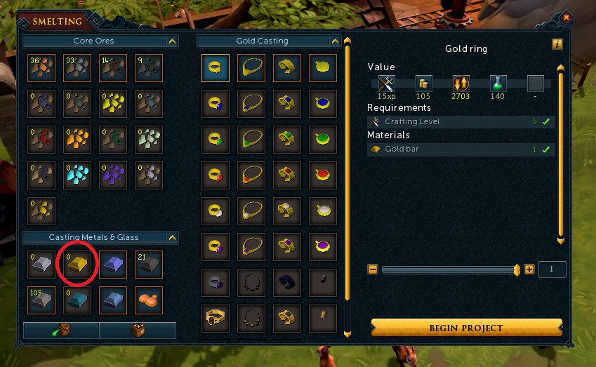 용광로를 클릭하고 아래 부분 은괴, 금괴를 클릭하면 어떤 장신구를 만들 수 있는지 나온다. 무료 계정은 은괴로 만들 수 있는게 별로 없다. 금괴로는 제법 있긴 한데...