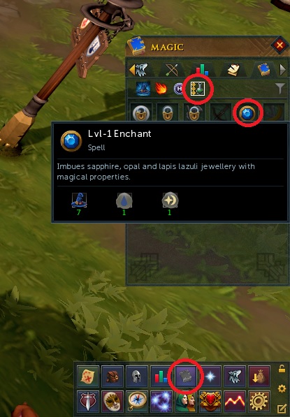 마법책 아이콘을 클릭, Magic Spells(skilling)을 선택하면 Lvl-1 Enchant라는게 있다. 매직 스킬 7레벨과 Water Rune 1개, Cosmic Rune 1개가 필요하다. 매직 스킬은 1레벨 troll 조금만 잡아도 금방 오른다. water나 cosmic은 그냥 경매장에서 사는게 속편하다. cosmic은 어차피 무료 계정으로는 못 만든다.
