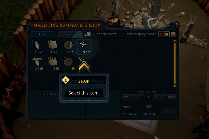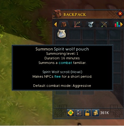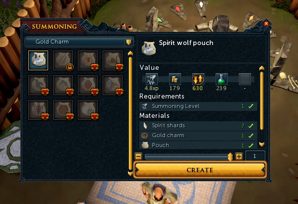 소환수를 부르기 위해서 필수적인게 위 상점 이미지의 순서대로 Spirit shards, Pouch, Gold charm, 그리고 2차 재료이다. 여기선 늑대를 불러낼거기 때문에 2차 재료는 늑대 뼈(wolf bones)를 사용하는거다.