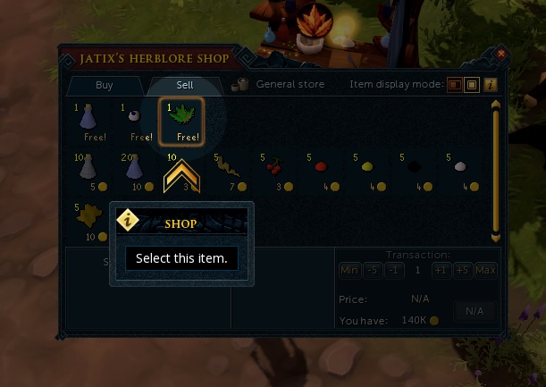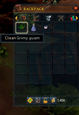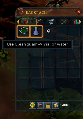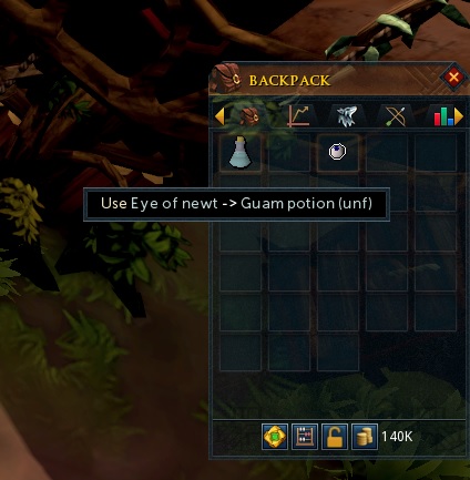 이제 2차 재료를 앞서 만든 시약에 사용하자. Eye of newt를 클릭 Guam potion(unf)에 사용한다.