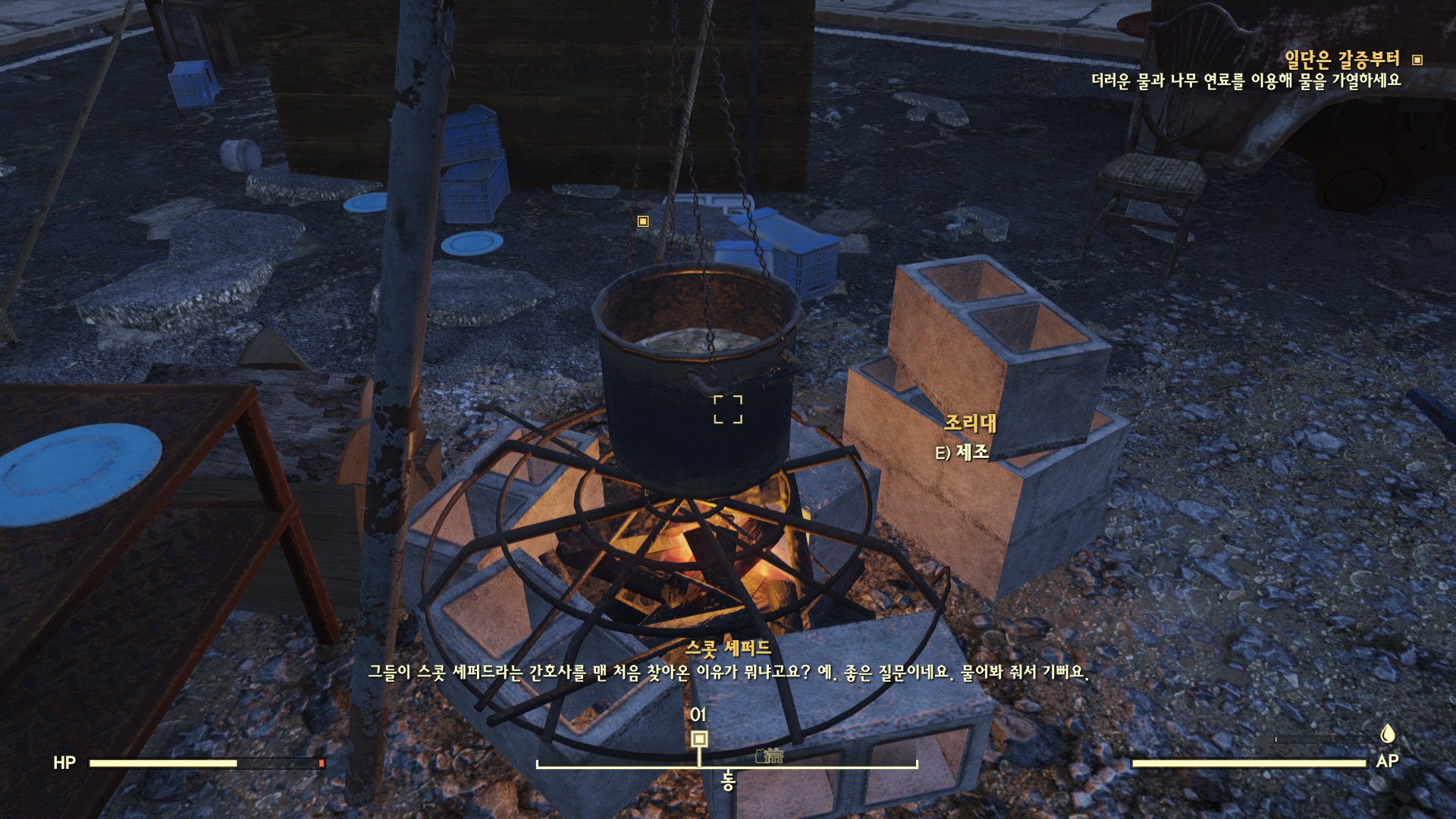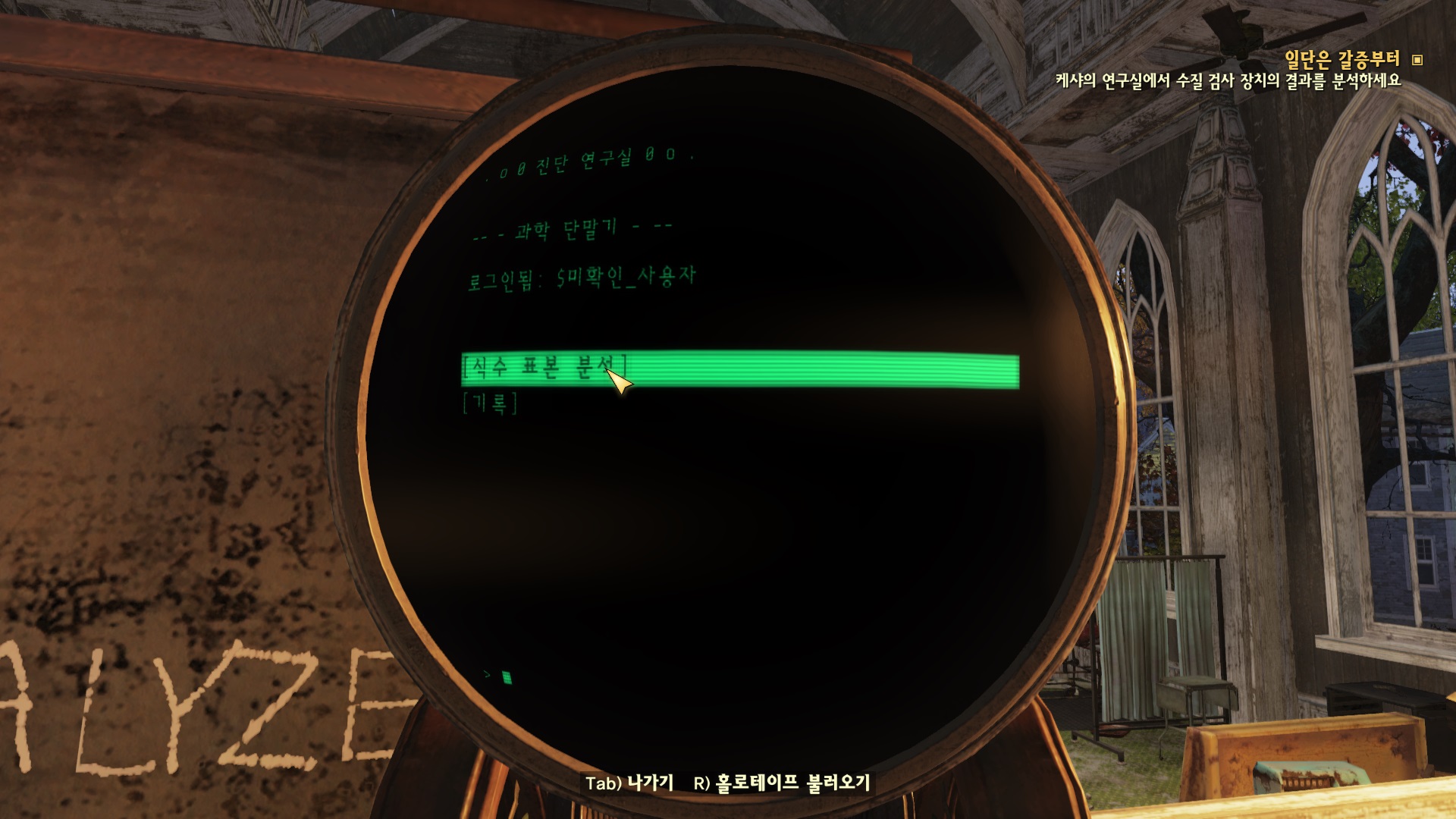 연구실의 단말기에서 '식수 표본 분석'을 하자. 물 유형은 불결함, 질병 가능성 심함. 물을 끓여 먹어야 되니 끓이는 방법을 알려준다고 한다.