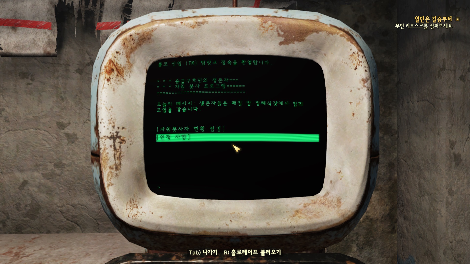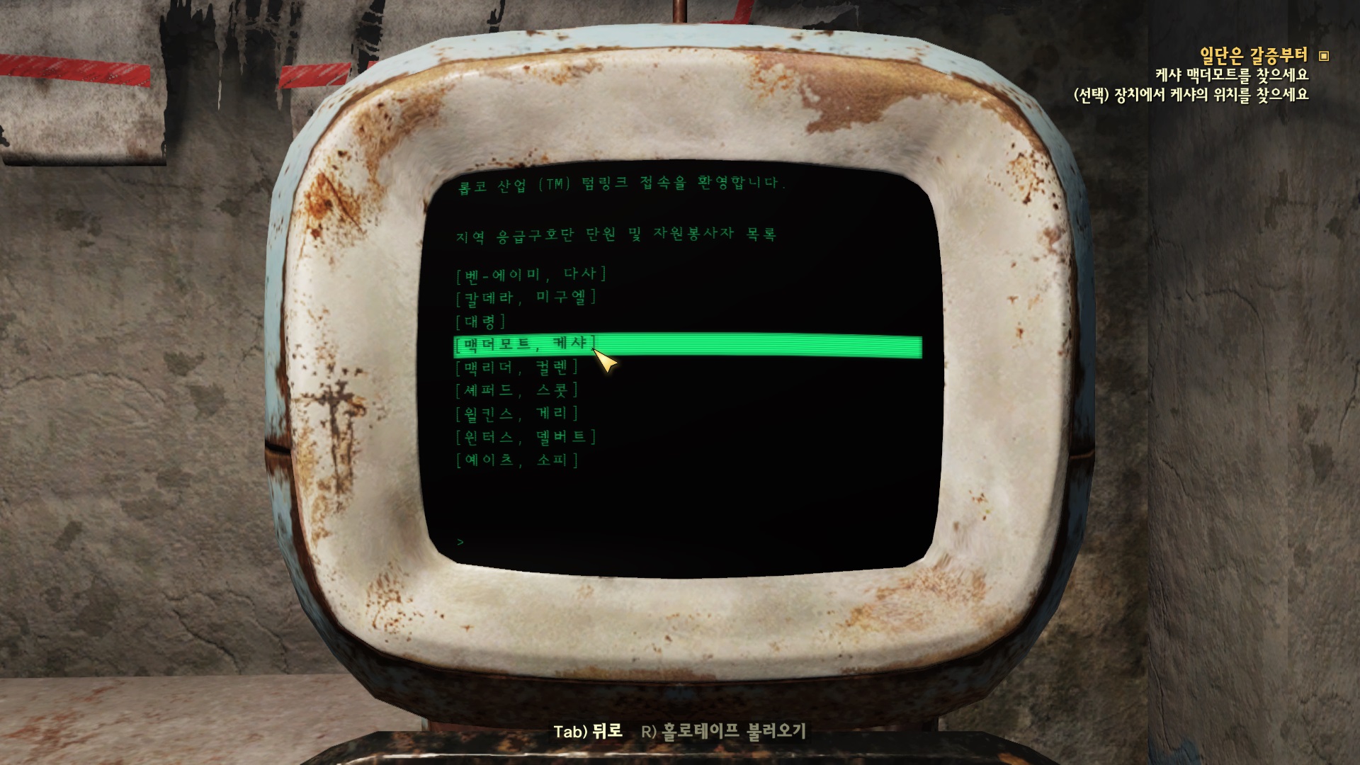 자원 봉사자로 등록을 끝내고 나면 키오스크에서 '인적 사항'을 통해 다른 사람들의 상황을 알 수 있다. 우선 퀘스트의 인물, 케샤 맥더모트의 최근 활동을 찾아보자.