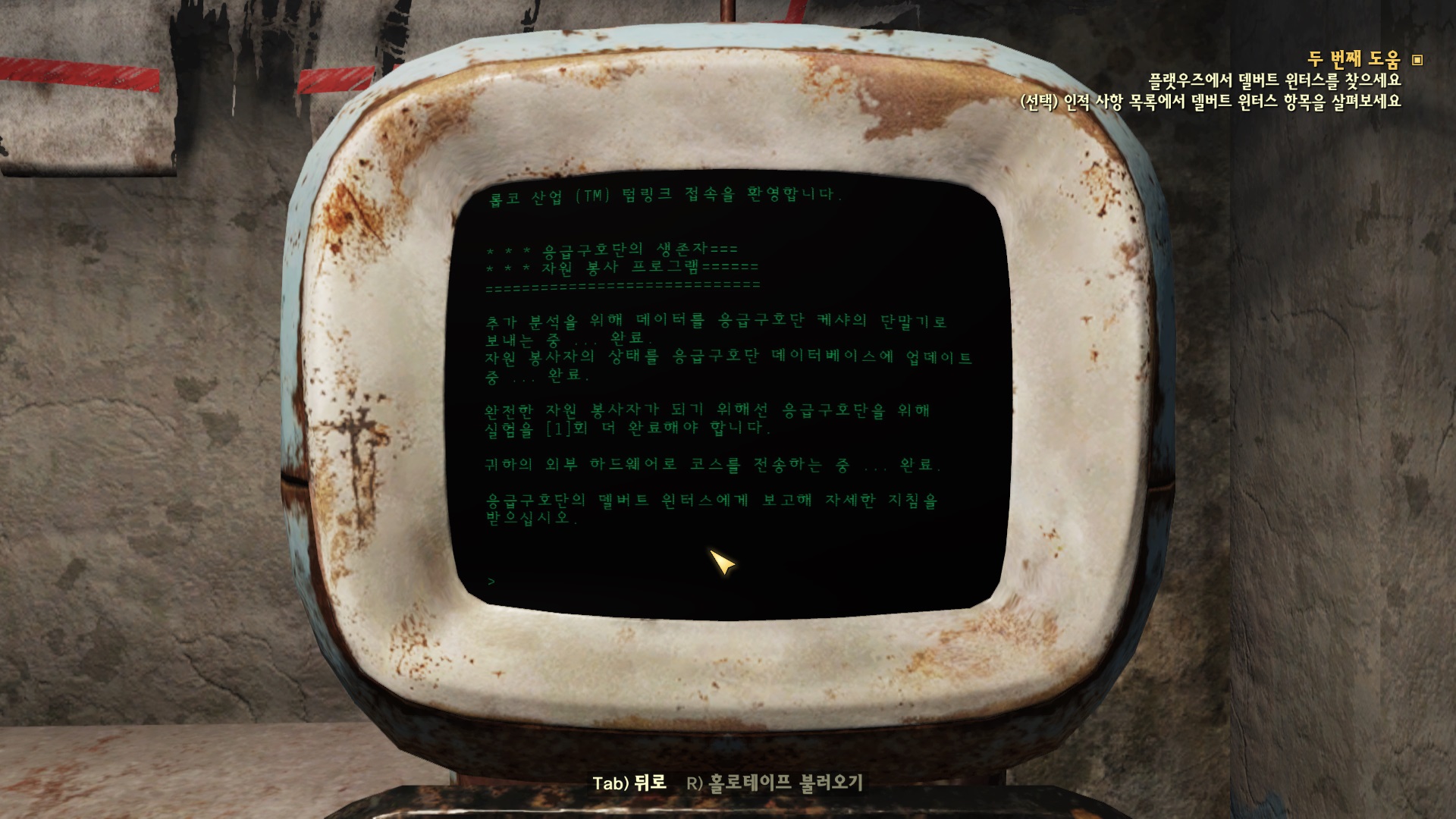 '자원 봉사자 현황 점검'을 클릭하게 되면 퀘스트가 완료된다. 이어서 '두 번째 도움' 퀘스트가 시작된다.