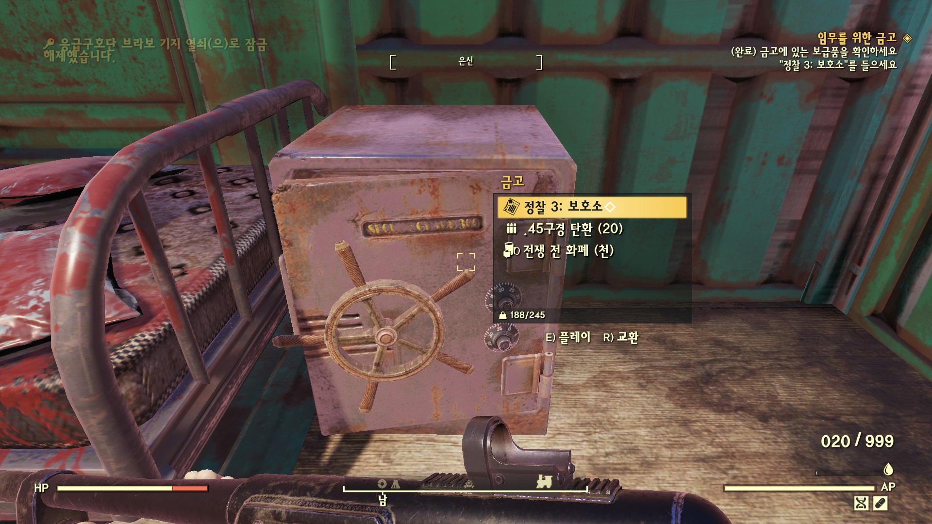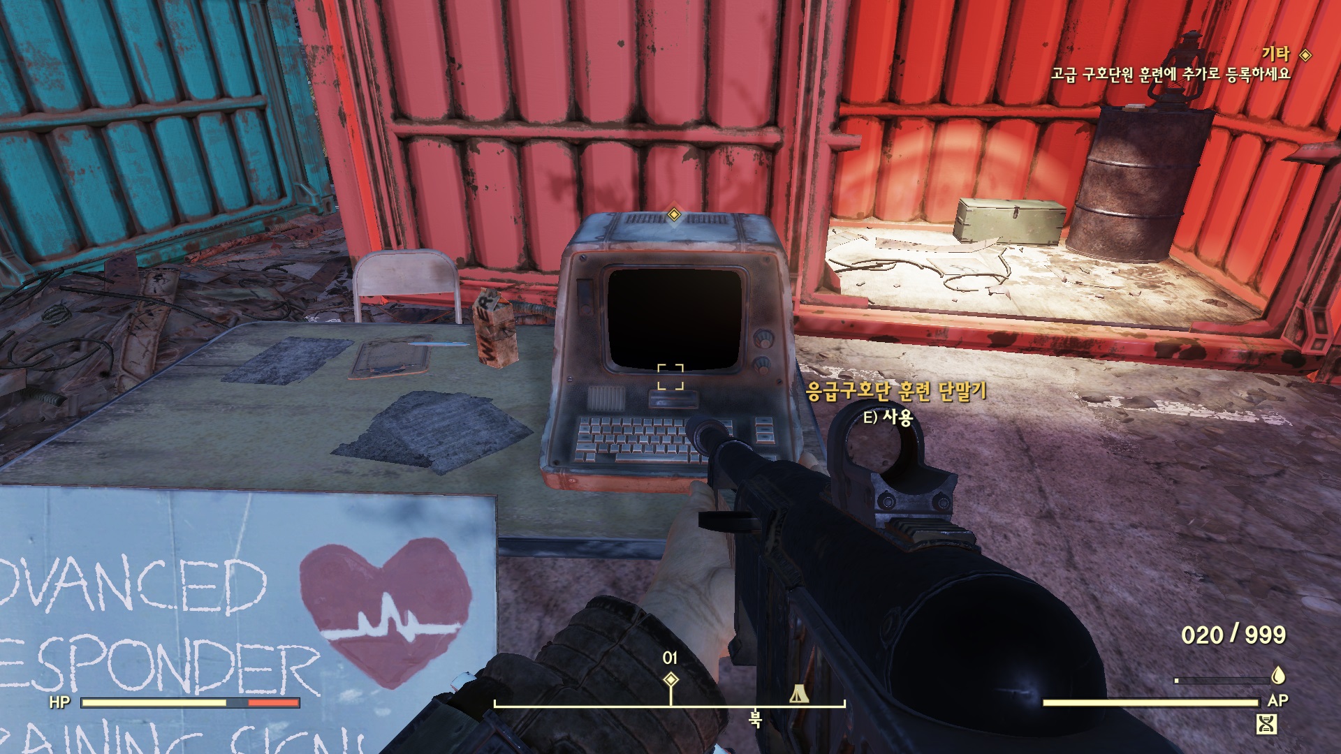 응급 치료소 텐트에 들어가면 잠긴 금고가 있고 옆에 단말기가 있다. 단말기에 들어가서 '금고 제어 -> 잠금 장치 해제'를 선택하면 금고가 열린다. '정찰 2: 응급 치료소'를 획득하면 재생되면서 다음으로 이어진다.