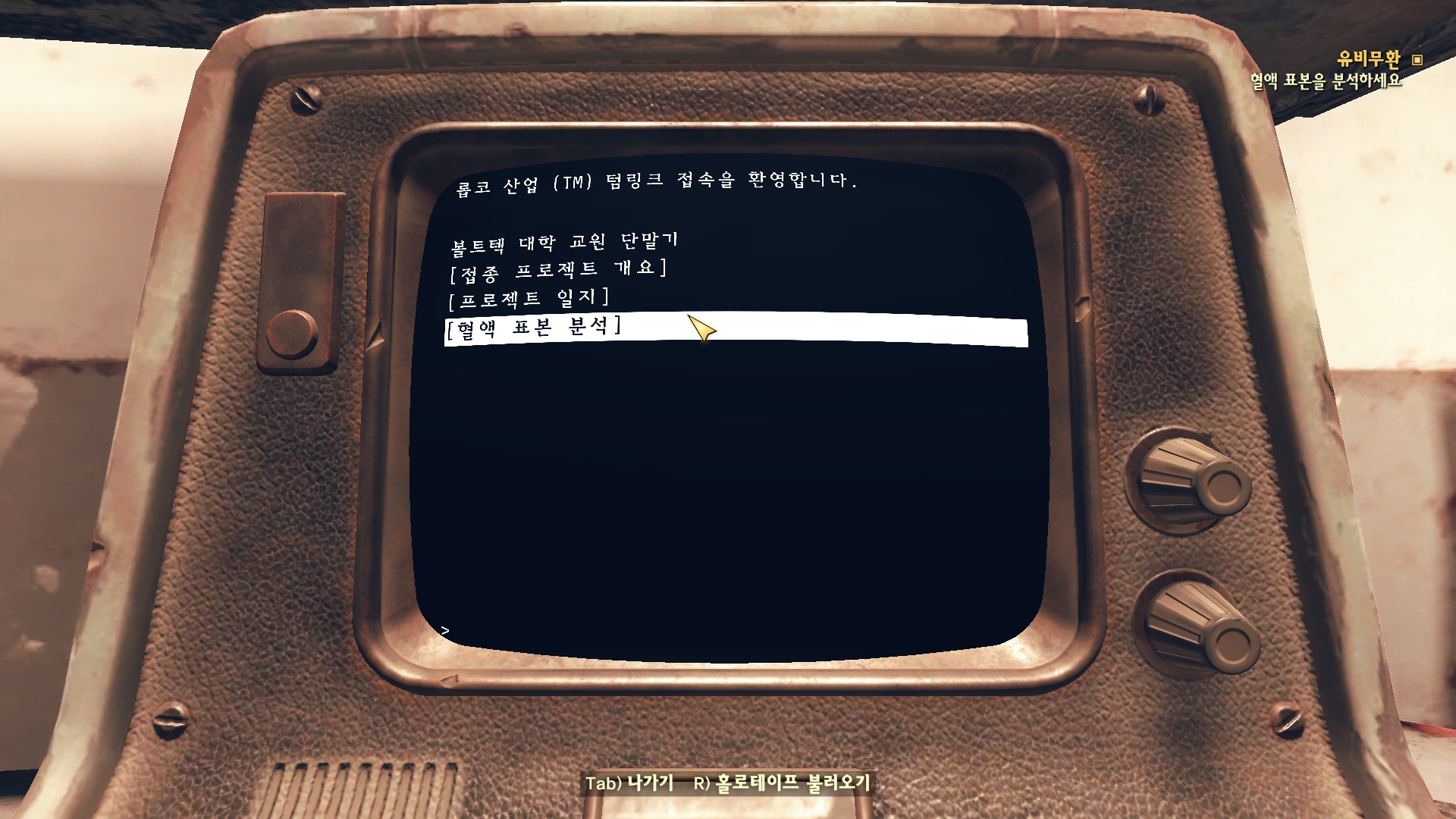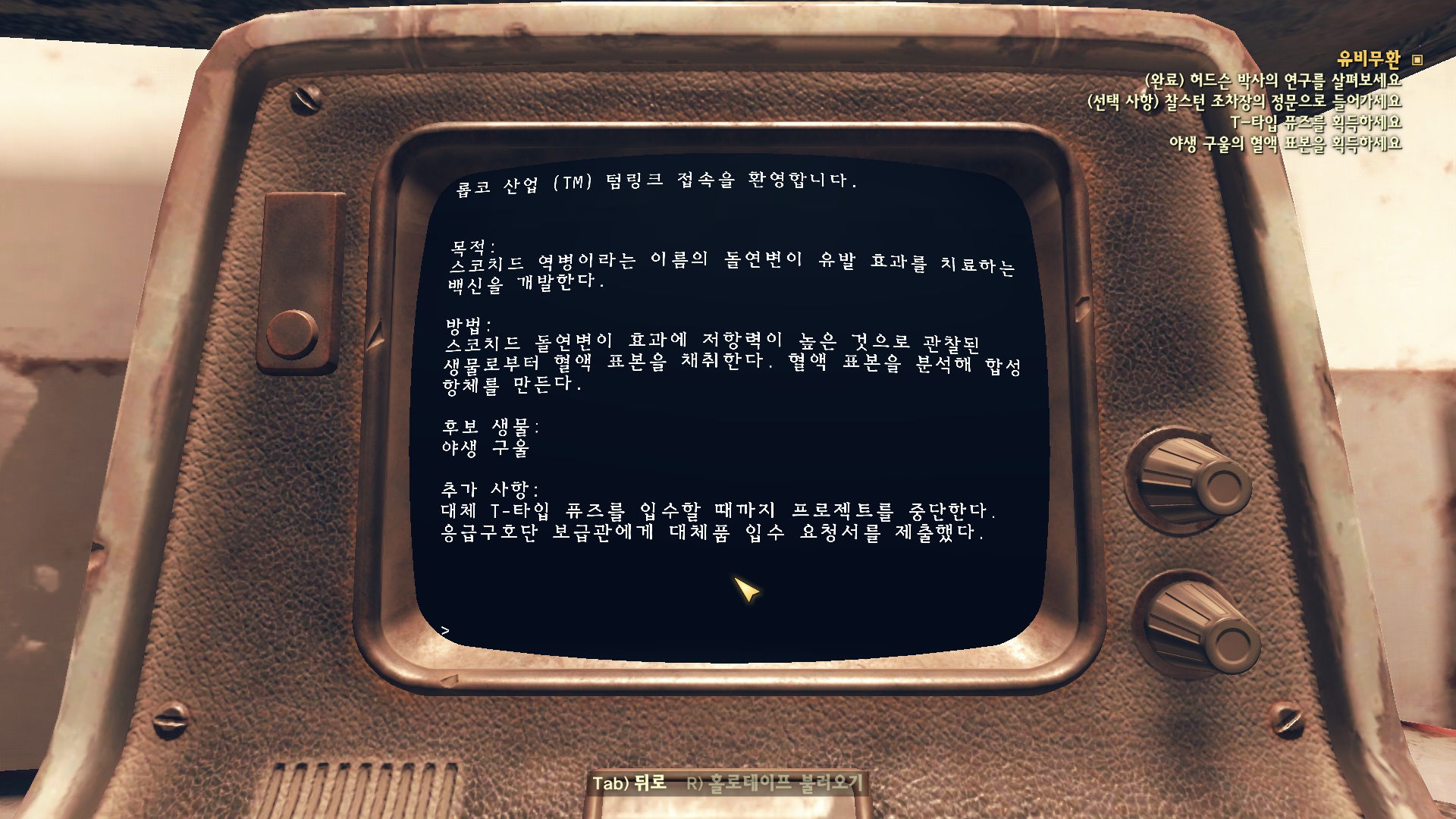 연구실 안에 들어가면 단말기가 보인다. 접속해서 '접종 프로젝트 개요'를 선택하자. 그러면 T-타입 퓨즈와 야생구울 혈액 표본이 필요하다고 한다.