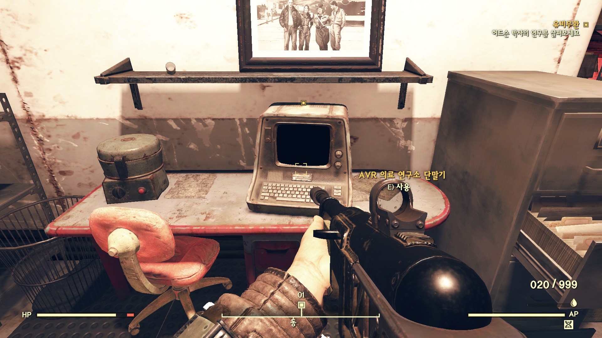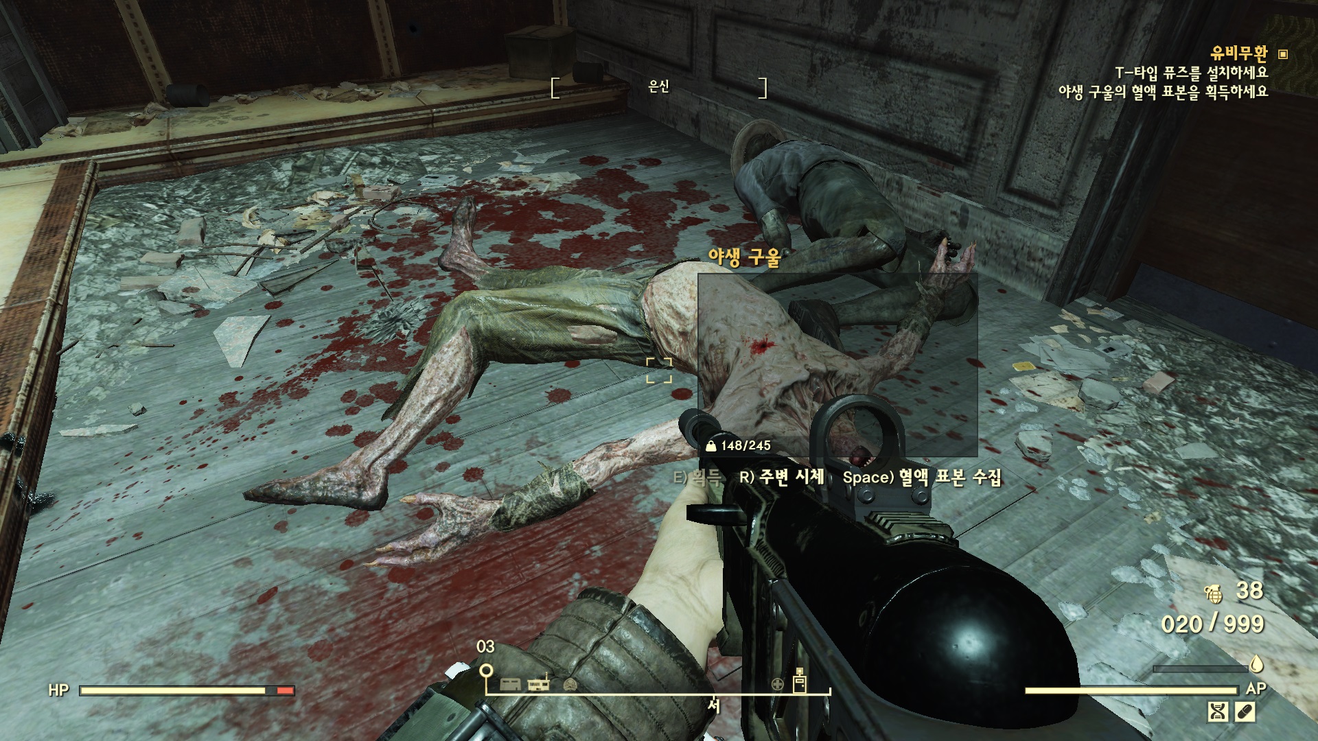 아이템 형식으로 드랍되는 줄 알았는데 아니었다. 구울을 때려 잡고 Space 키를 눌러 따로 혈액 표본을 수집해야 된다. 이제 다 모았으니 AVR 의료센터 연구실로 다시 돌아가자.