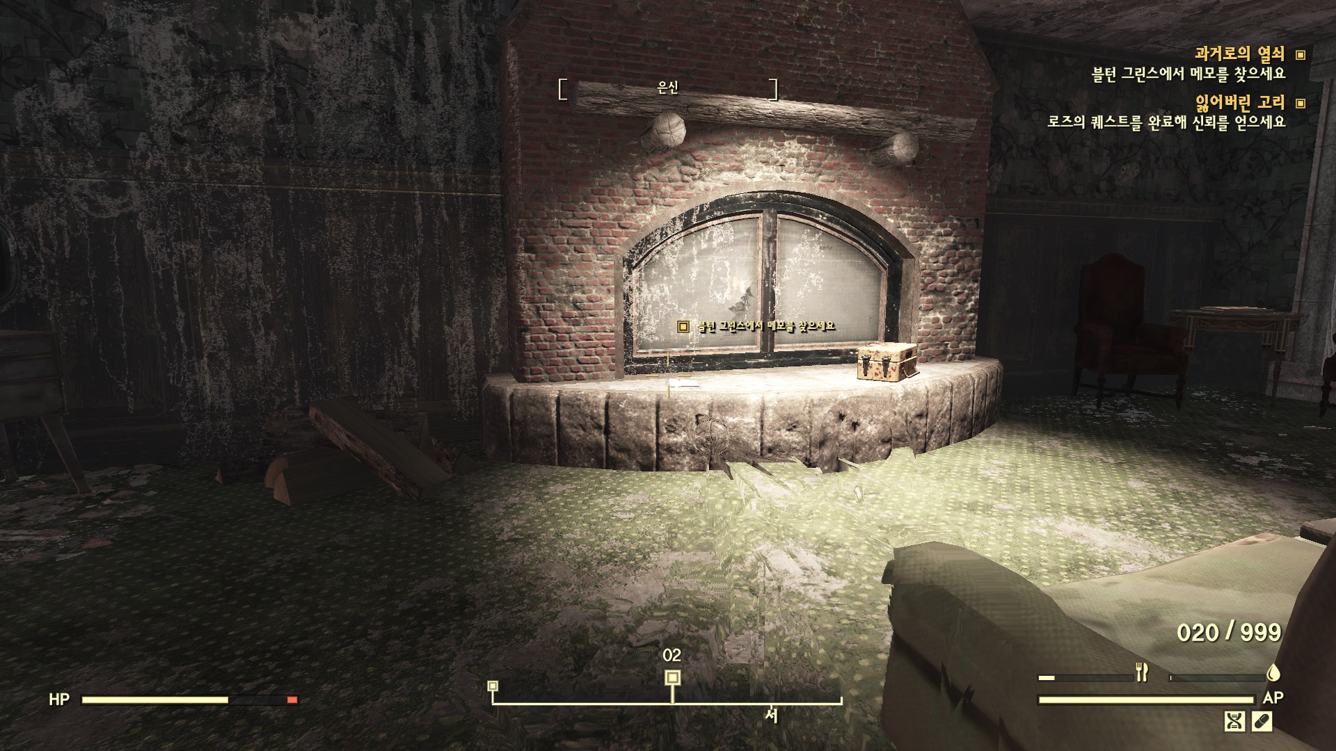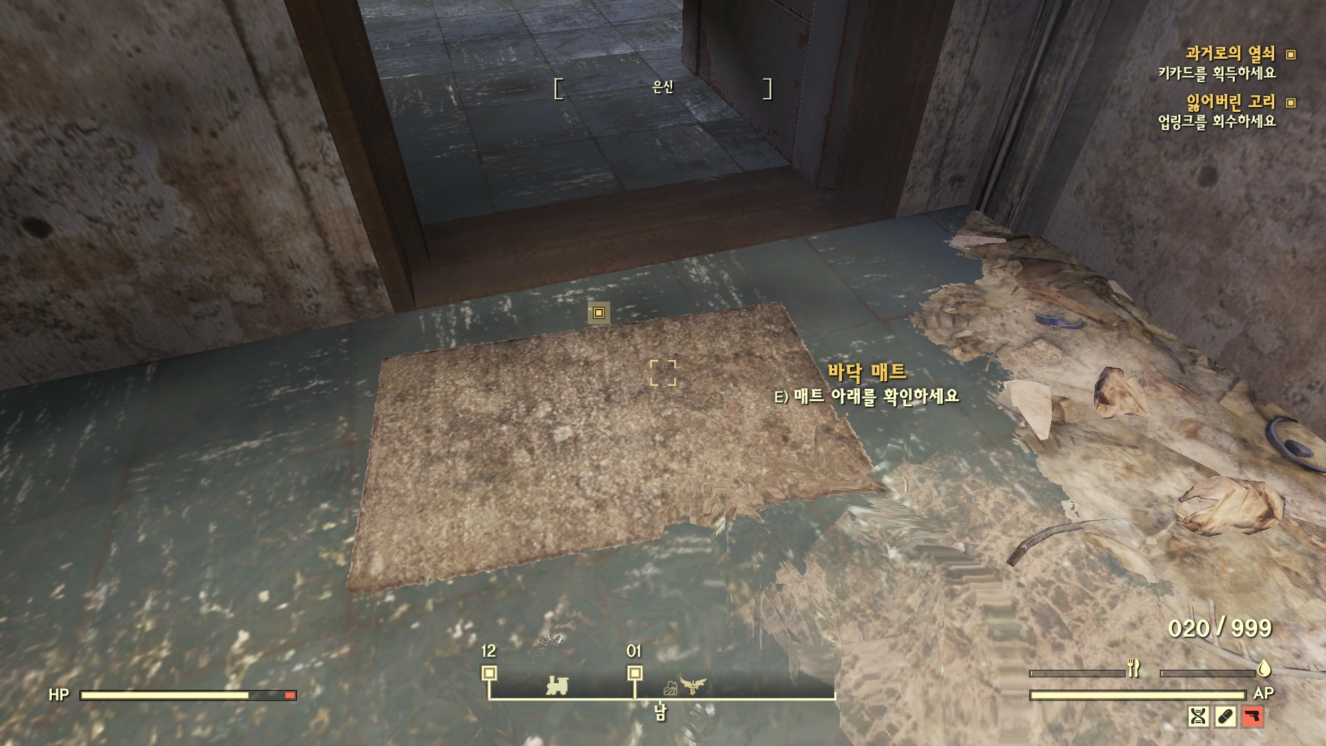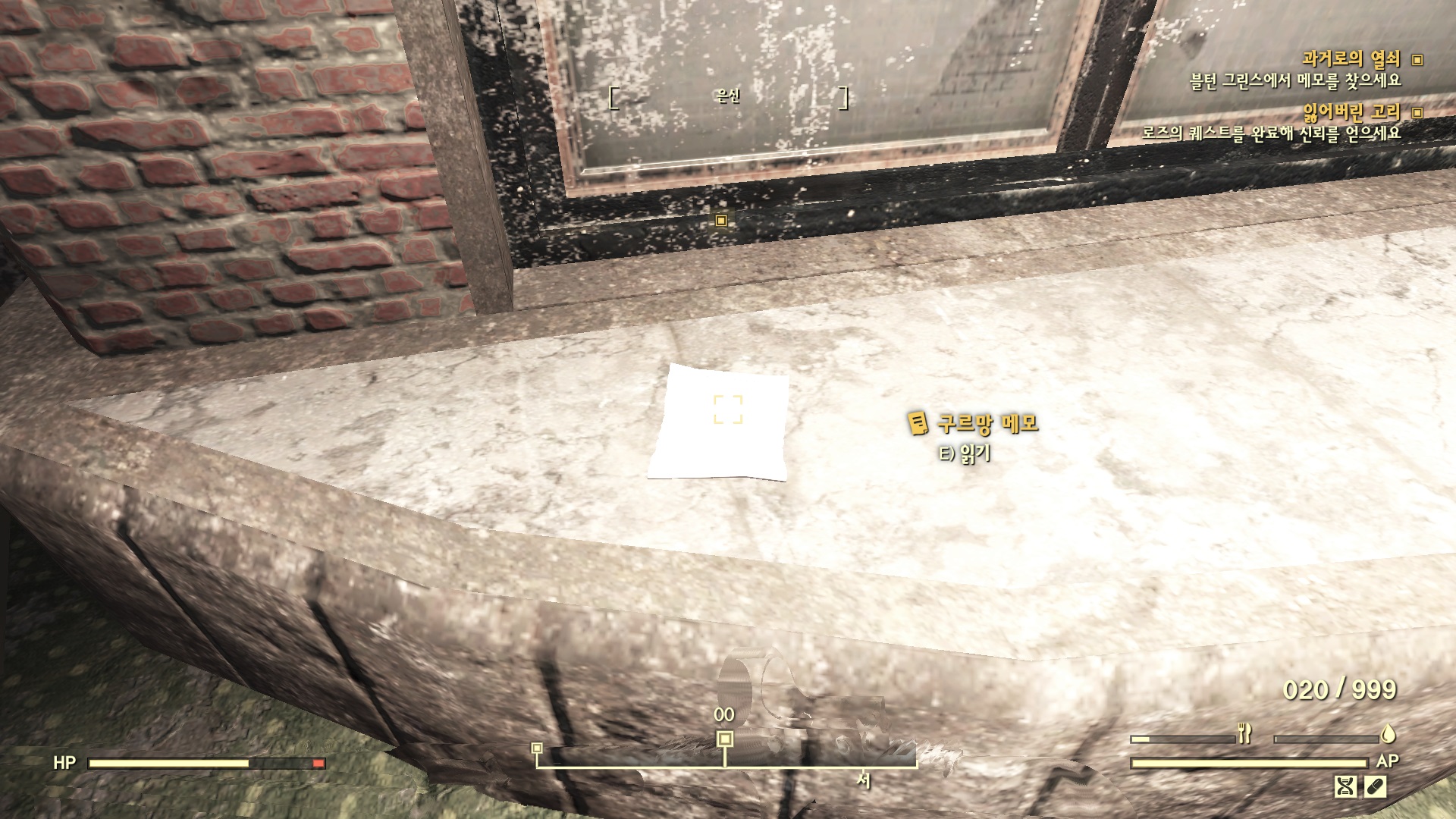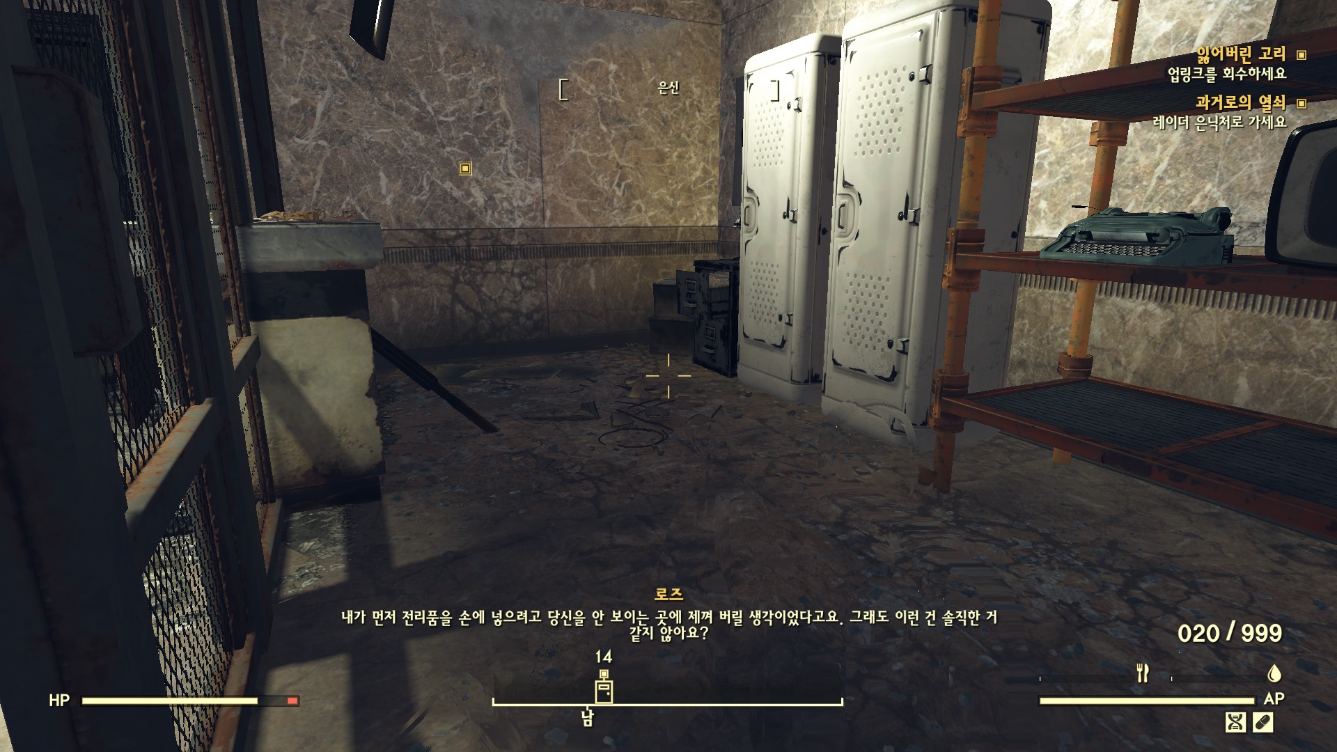 퀘스트를 완료하게 되면 레이더 파워아머 풀셋이 장착된 파워아머 골격(무게 0)을 주는데 이걸 사용하면 무게 10짜리인 골격으로 변한다. 착용 할것 같으면 사용하면 되고 만약 저장하고 싶다면 무게 0일때 창고에 넣어두자.