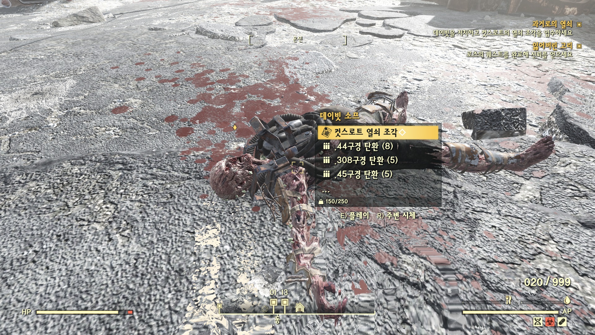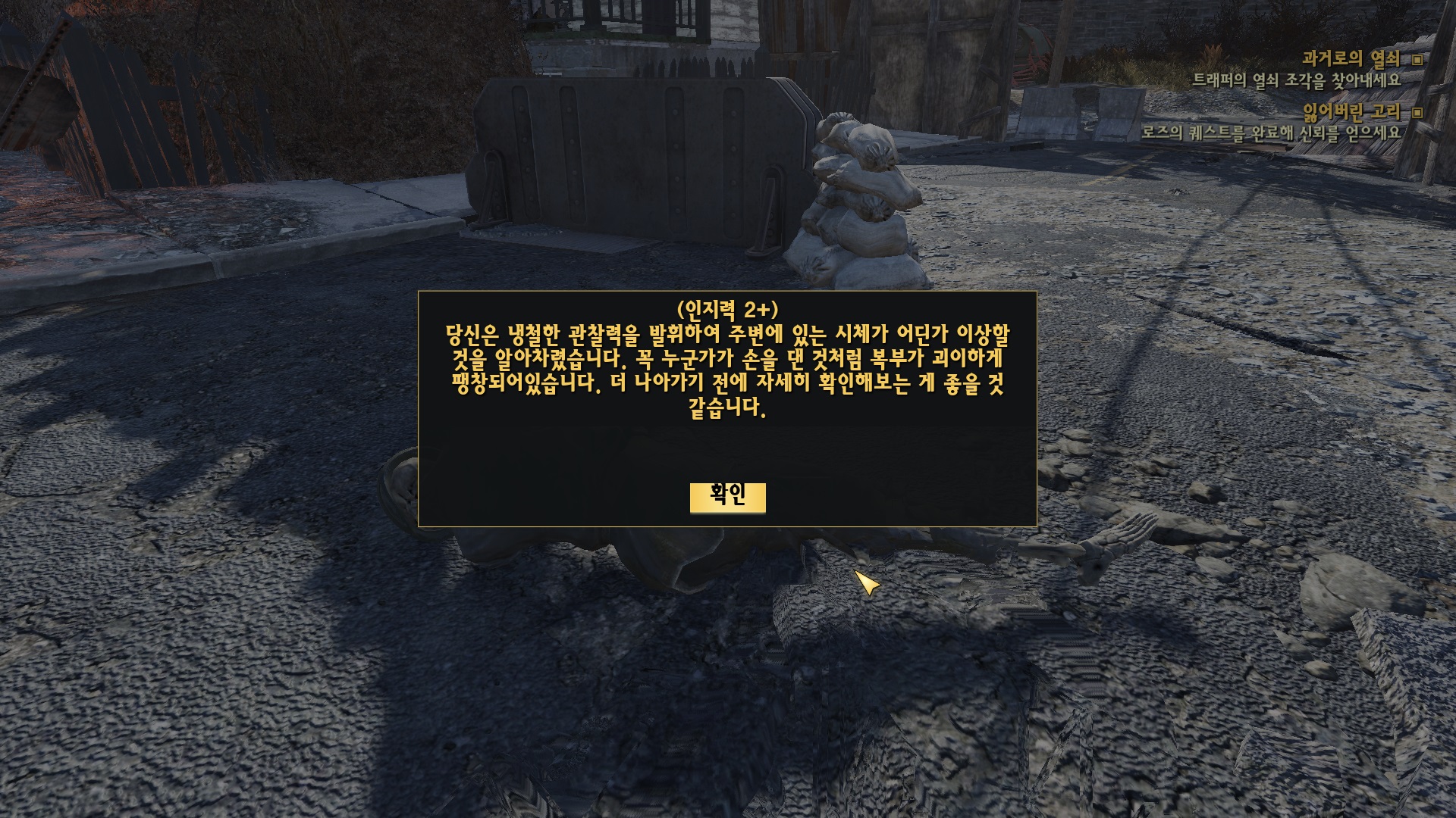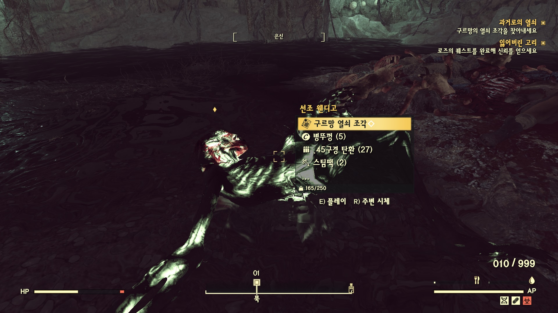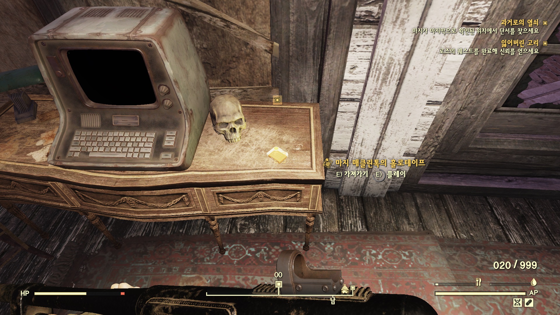 퀘스트를 완료하게 되면 레이더 파워아머 풀셋이 장착된 파워아머 골격(무게 0)을 주는데 이걸 사용하면 무게 10짜리인 골격으로 변한다. 착용 할것 같으면 사용하면 되고 만약 저장하고 싶다면 무게 0일때 창고에 넣어두자.