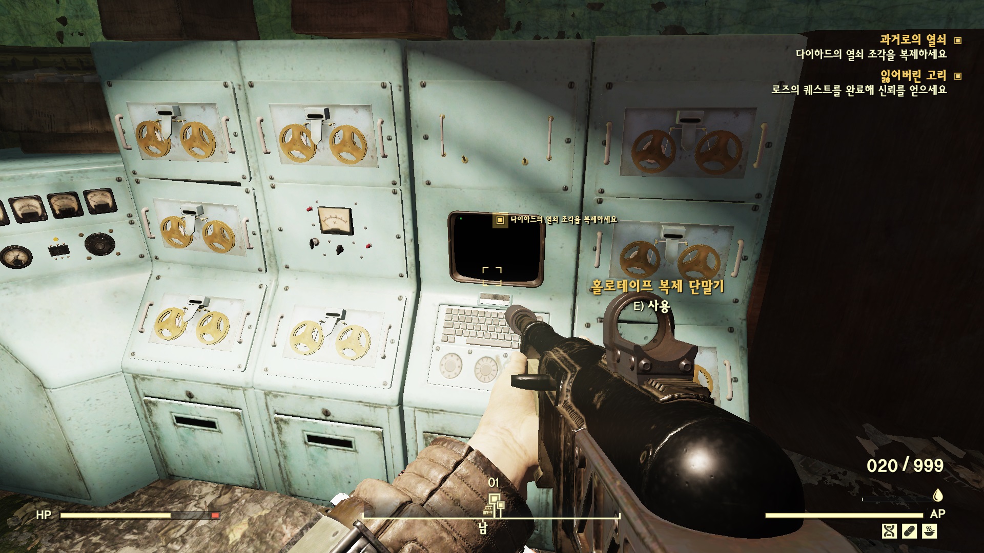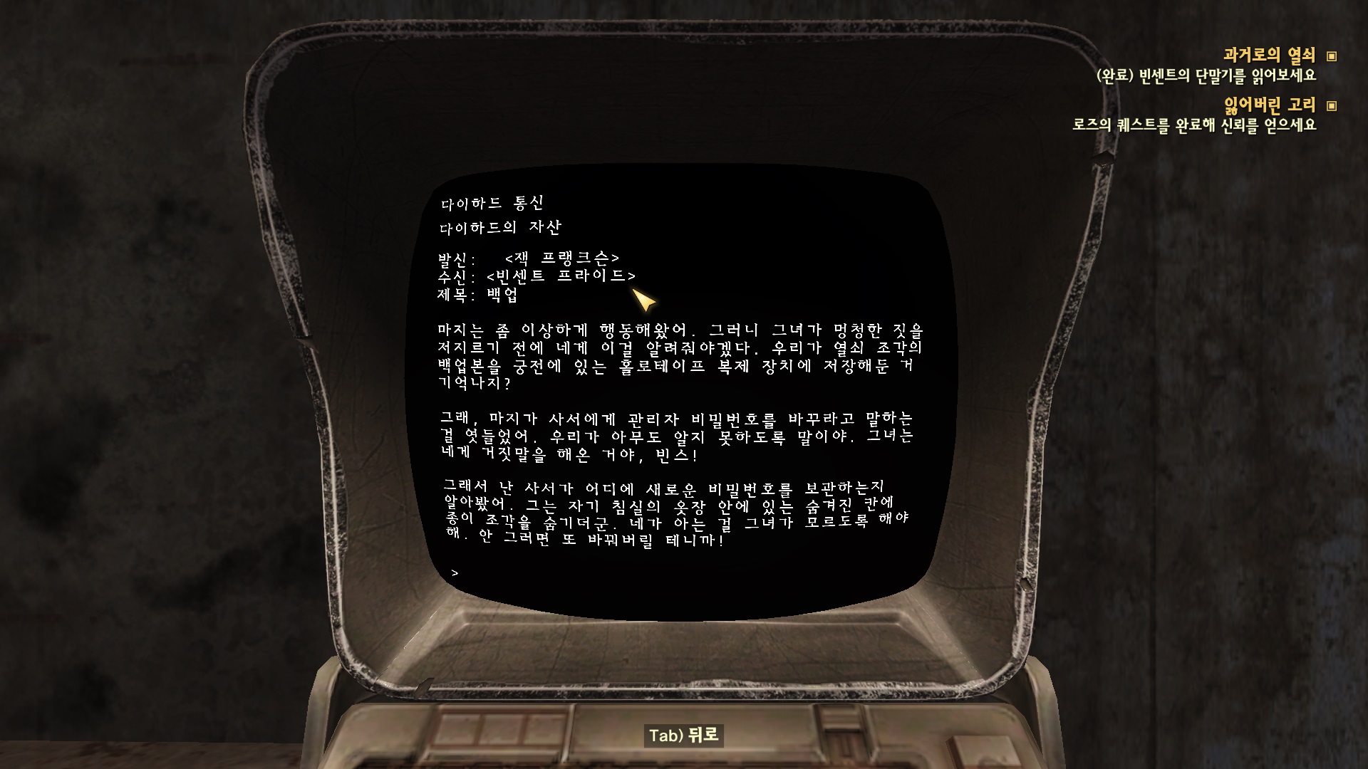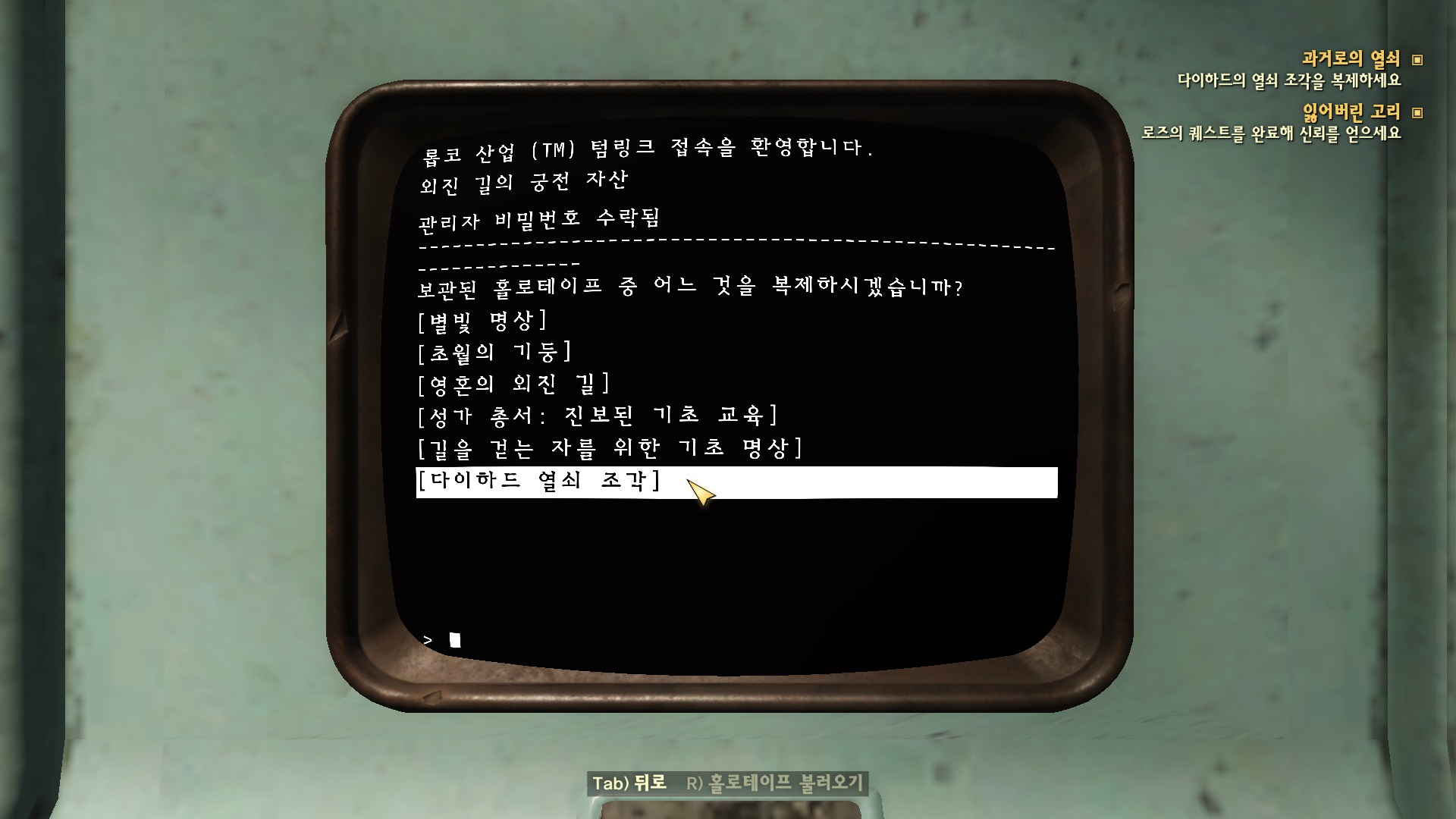 궁전 관리자 비밀번호 입수 후에 홀로 테이프 복제 단말기로 한다. '기록 보관소에서 복제하기 -> 다이하드 열쇠 조각'을 선택한다.