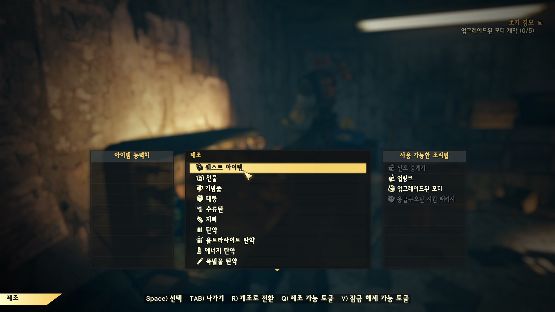 퀘스트 진행에 필요한 수리나 제작은 퀘스트 아이템 카테고리이니 꼭 알아두자.