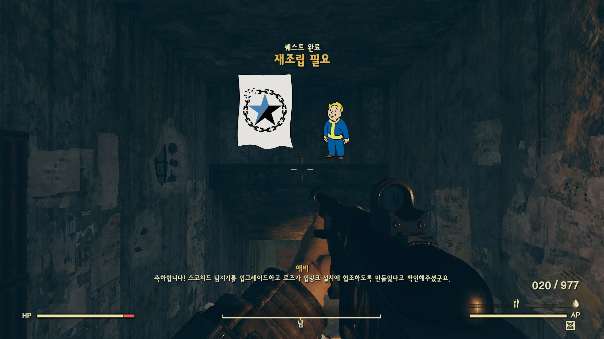 애비의 방공호 안에 들어가면 퀘스트 완료와 다음 퀘스트 '결실 (Coming to Fruition)'에 대해 얘기를 한다.