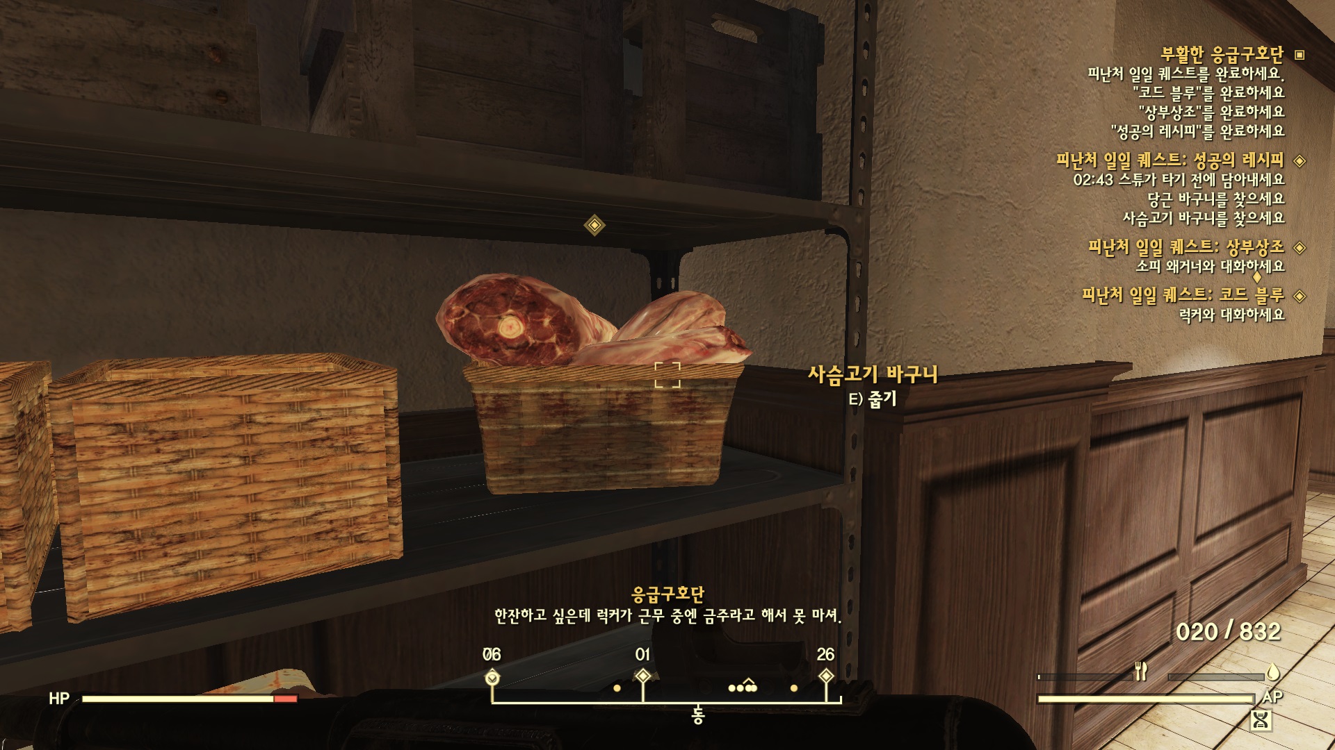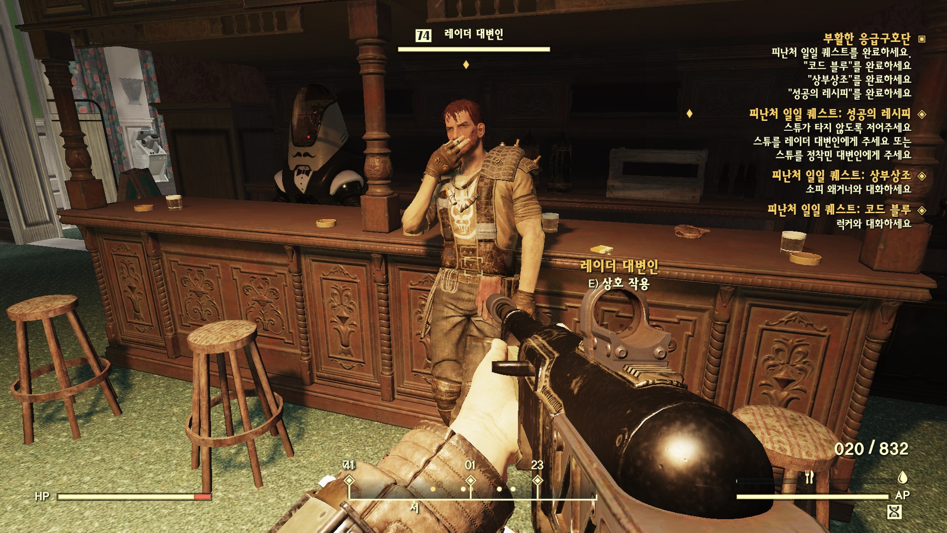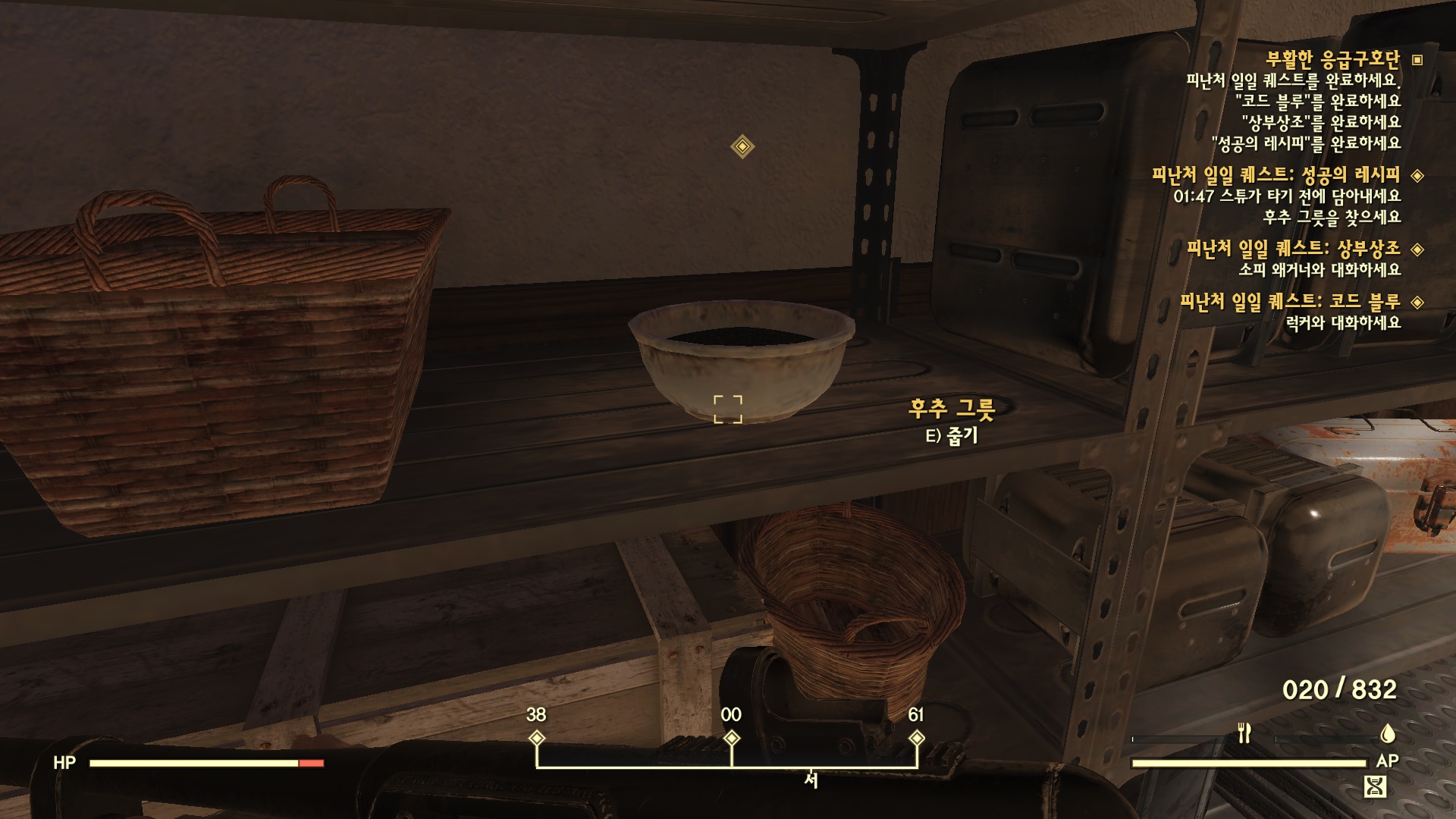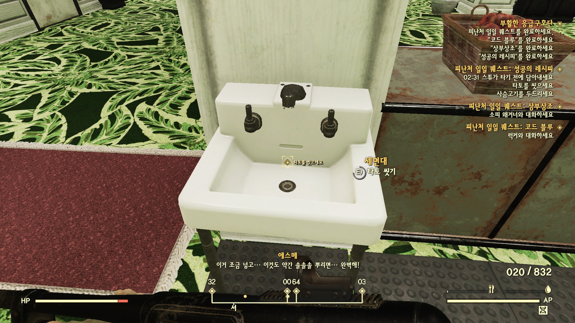 다음으로 에스메와 대화하면 부가적으로 뭘 넣을지 물어본다. 스팀팩, 사이코, 향신료. 뭘 넣던 말던 보상이나 우호도에 영향은 안 준다. 그저 반응만 다를 뿐.. 레이더는 사이코, 정착민은 스팀팩을 좋아한다. 향신료는 둘다 좋아한다.