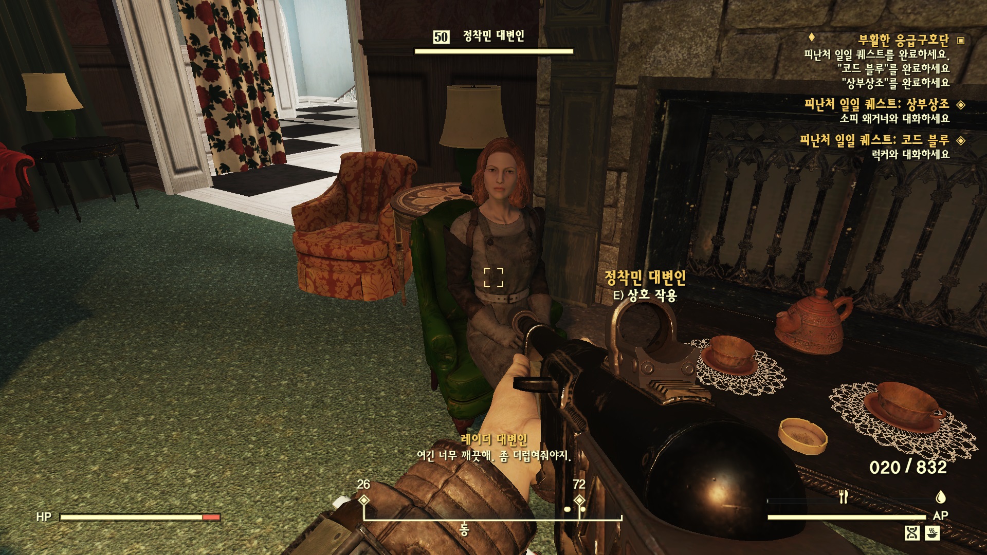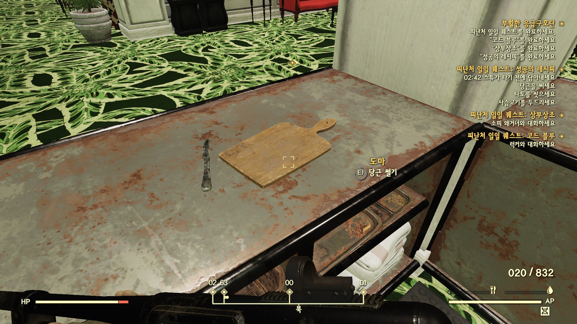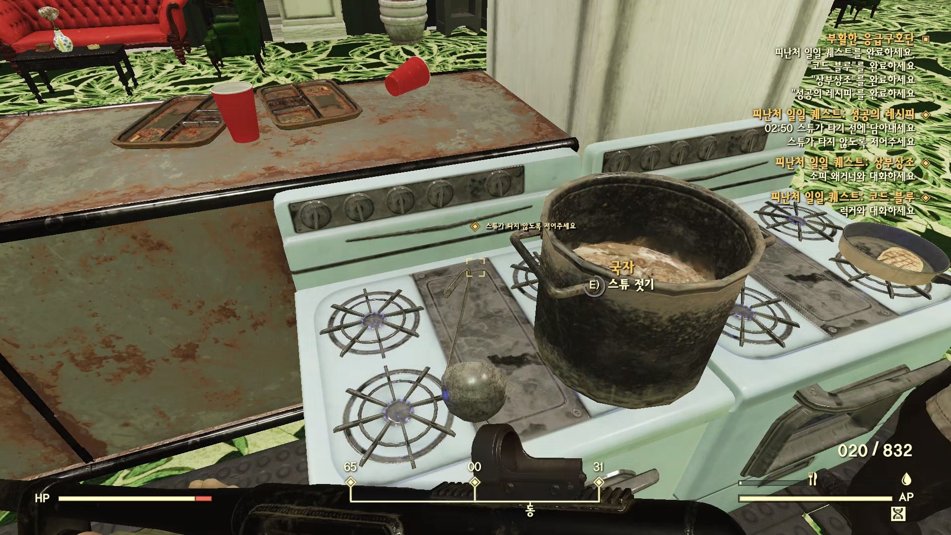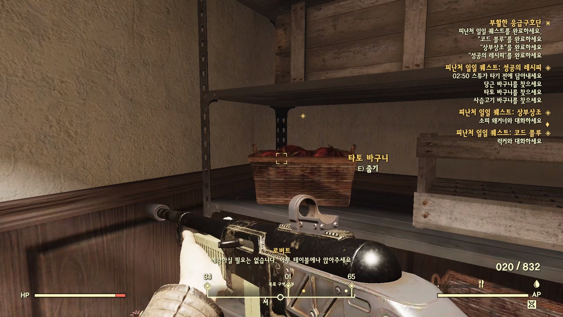 다음으로 에스메와 대화하면 부가적으로 뭘 넣을지 물어본다. 스팀팩, 사이코, 향신료. 뭘 넣던 말던 보상이나 우호도에 영향은 안 준다. 그저 반응만 다를 뿐.. 레이더는 사이코, 정착민은 스팀팩을 좋아한다. 향신료는 둘다 좋아한다.