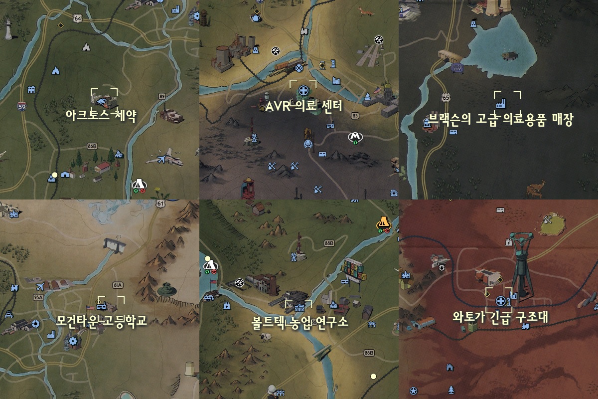아크토스 제약 지하 생태계 실험실(엘리베이터 타고 내려간다), AVR 의료 센터, 브랙슨의 고급 의료용품 매장, 모건타운 고등학교, 볼트텍 농업 연구소, 와토가 긴급 구조대 이렇게 6곳 중 한곳이 지정된다.