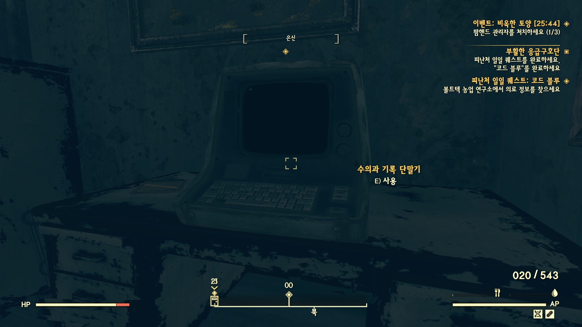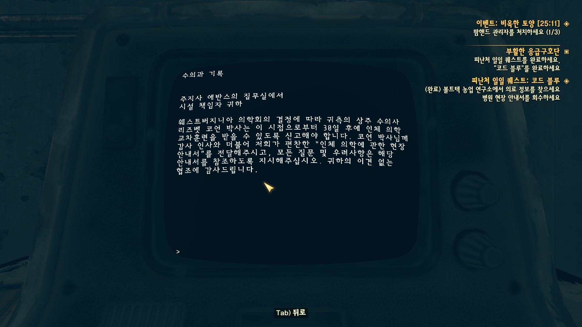 처음 하는 퀘스트인데 볼트텍 농업 연구소가 당첨! 가서 의료 정보를 찾아야 한다.