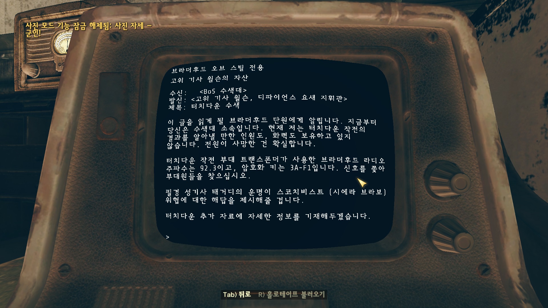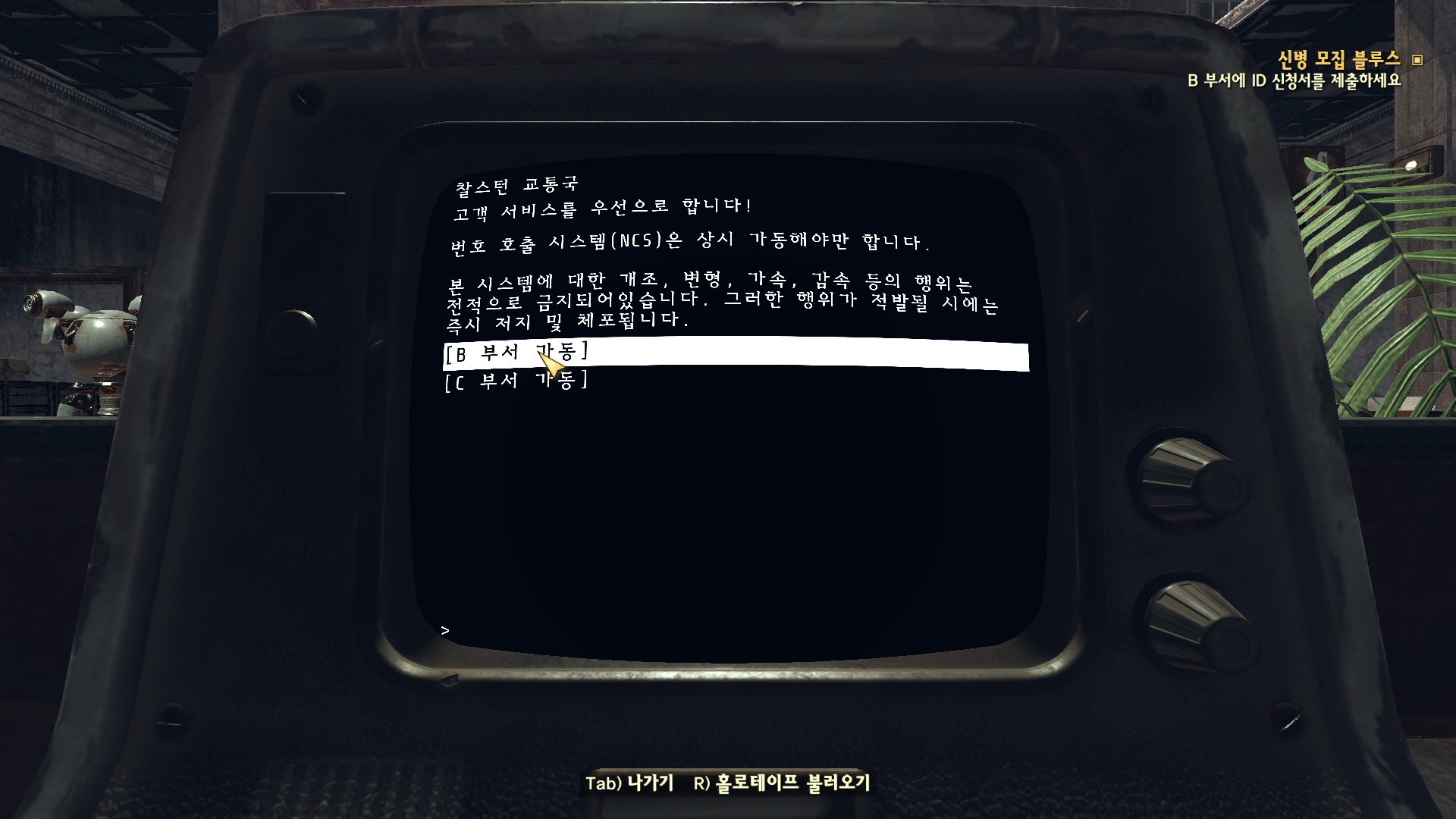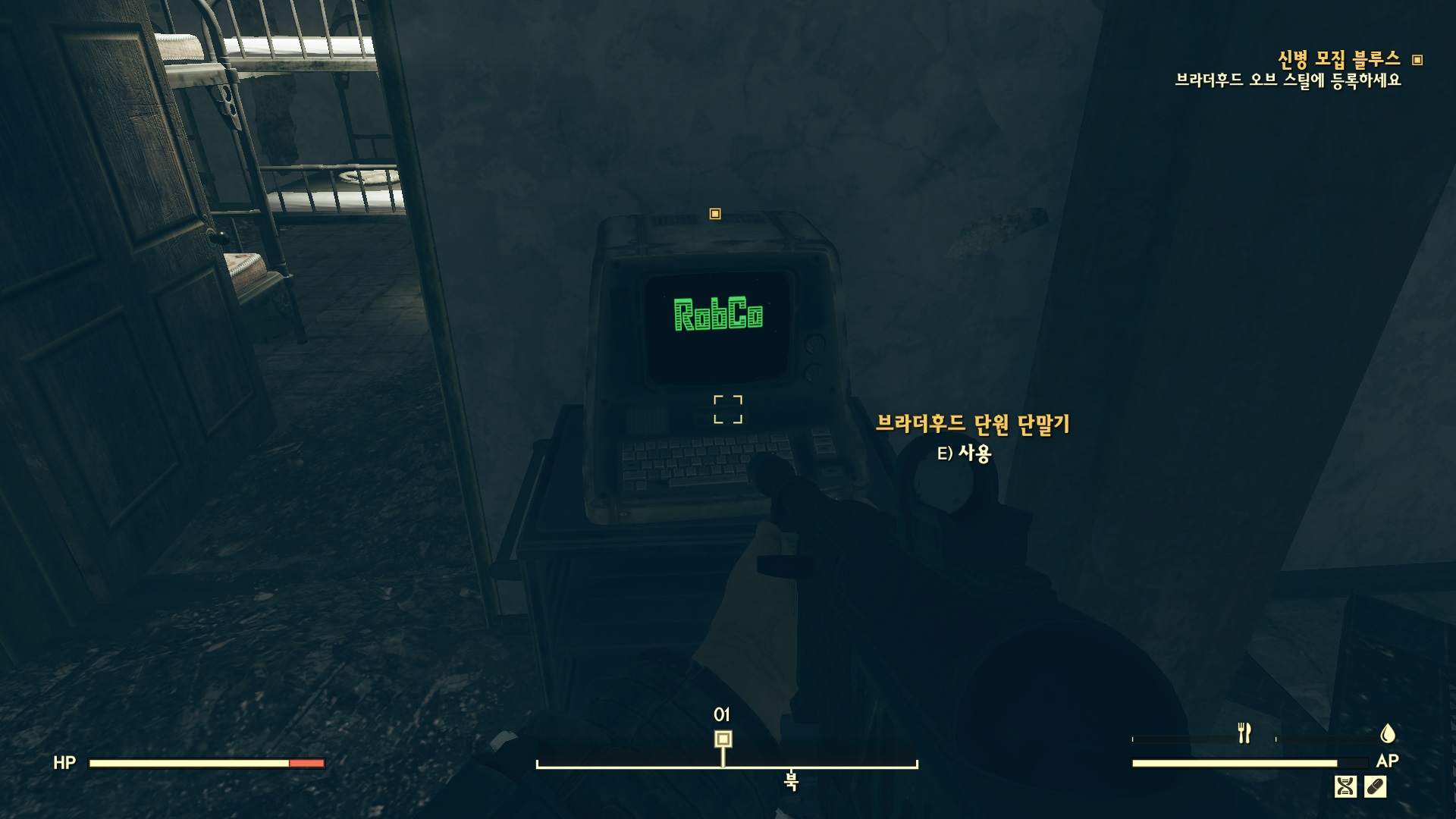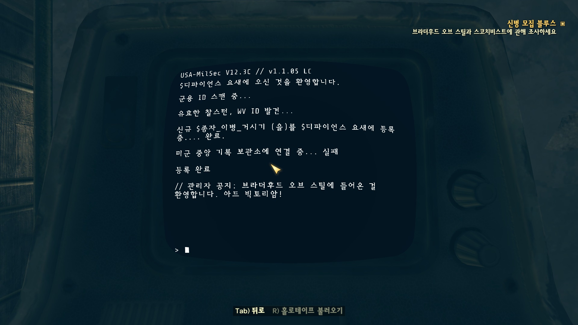 디파이언스 요새 3층, 레이저로 막힌 문 앞에 브라더후드 단원 단말기에 접속 한 후 '신규 단원 등록 => 군용 ID 카드 스캔'을 선택한다.