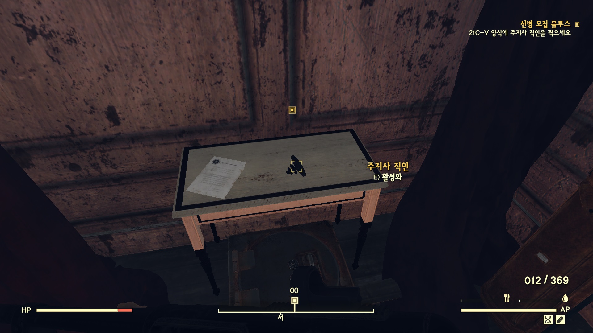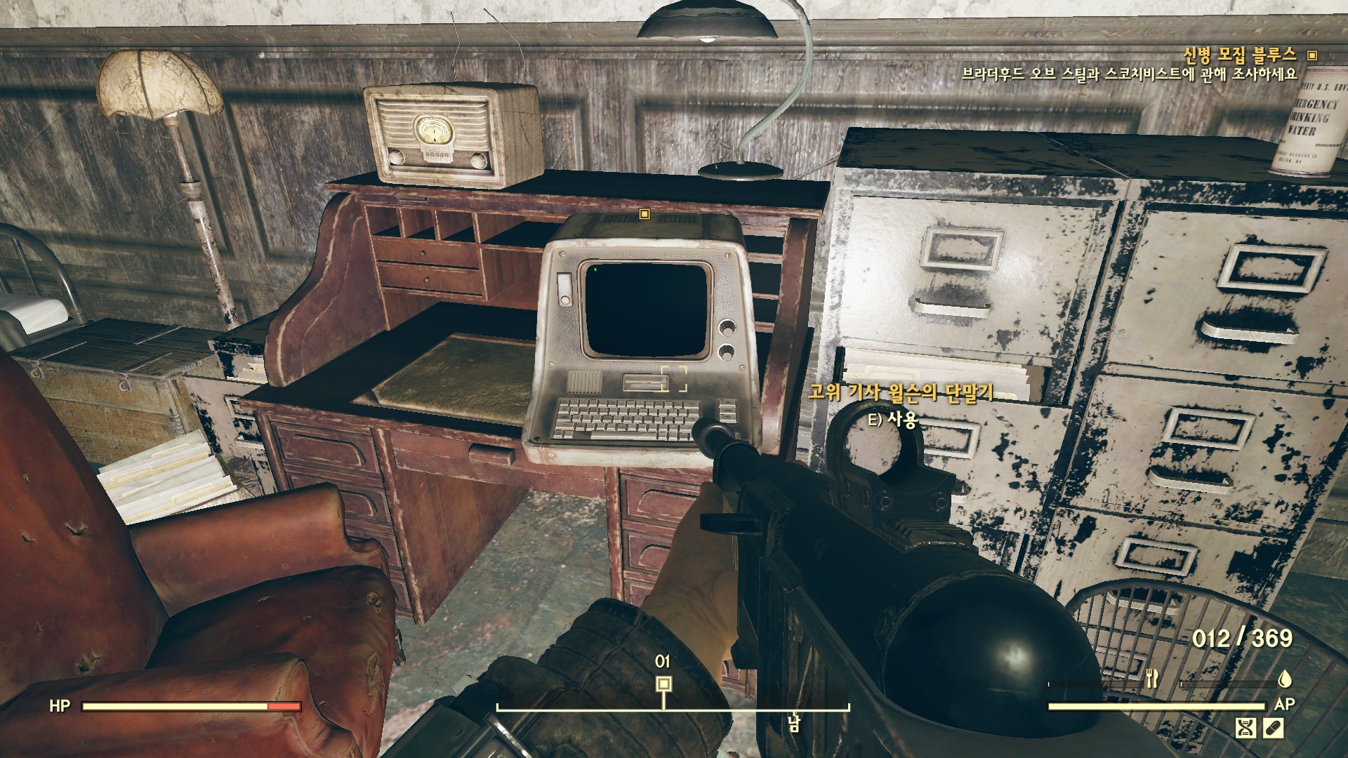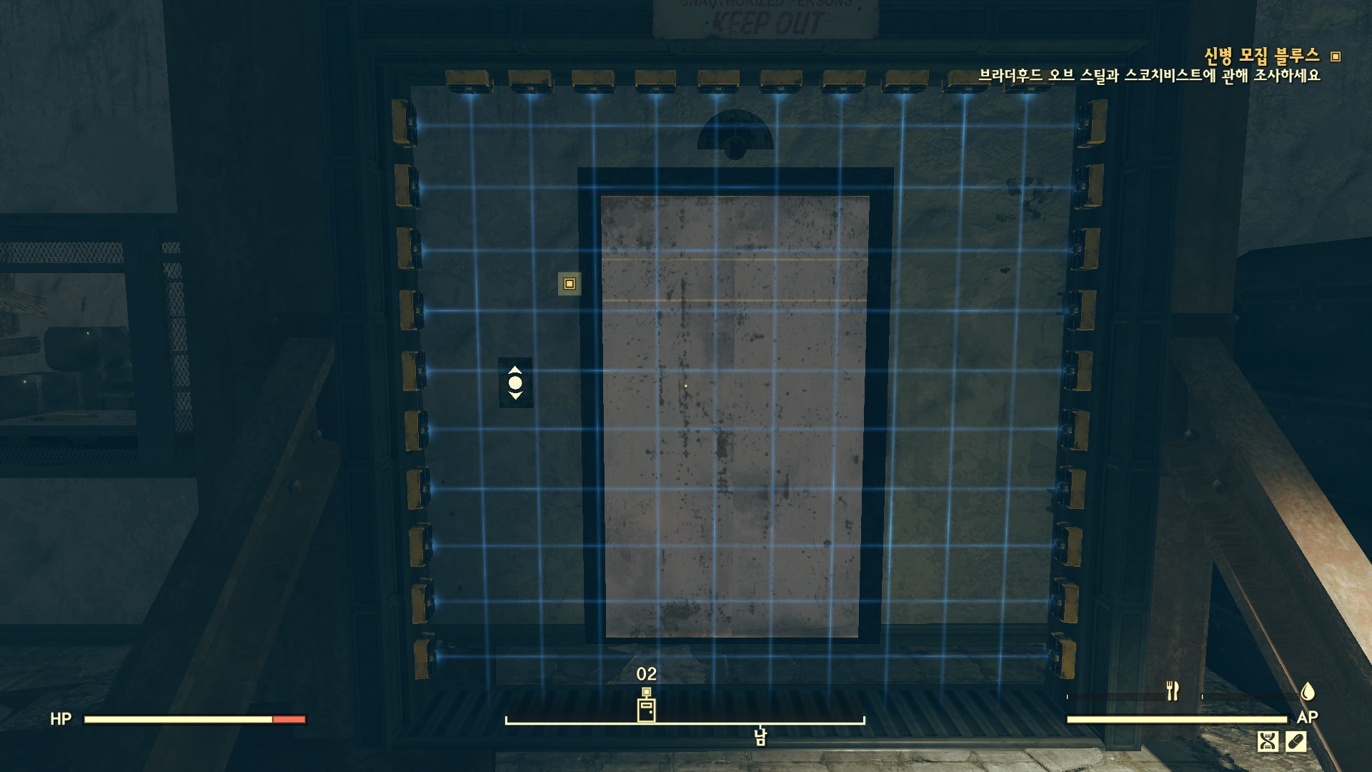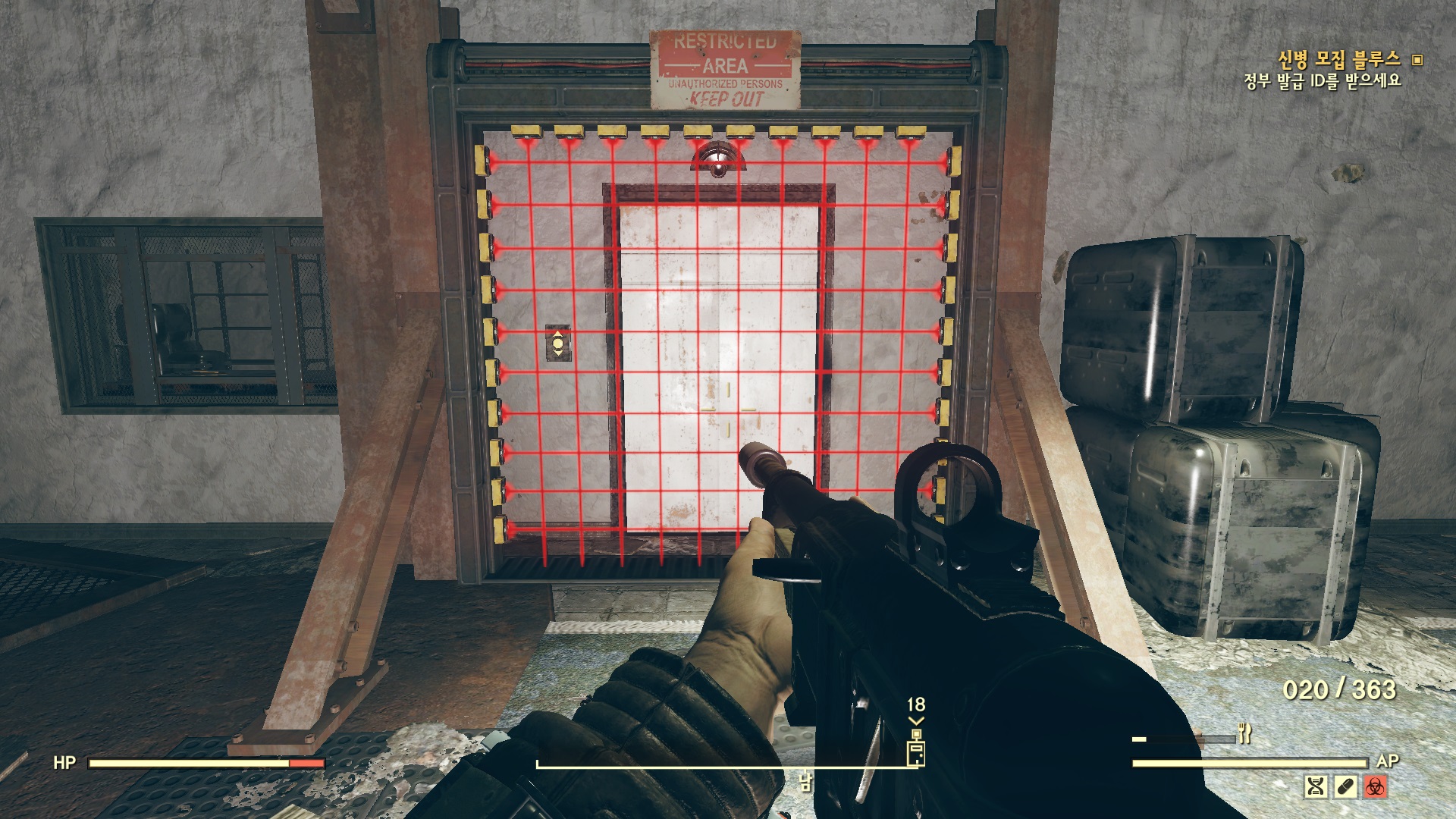 디파이언스 요새 3층, 레이저로 막힌 문 앞에 브라더후드 단원 단말기에 접속 한 후 '신규 단원 등록 => 군용 ID 카드 스캔'을 선택한다.