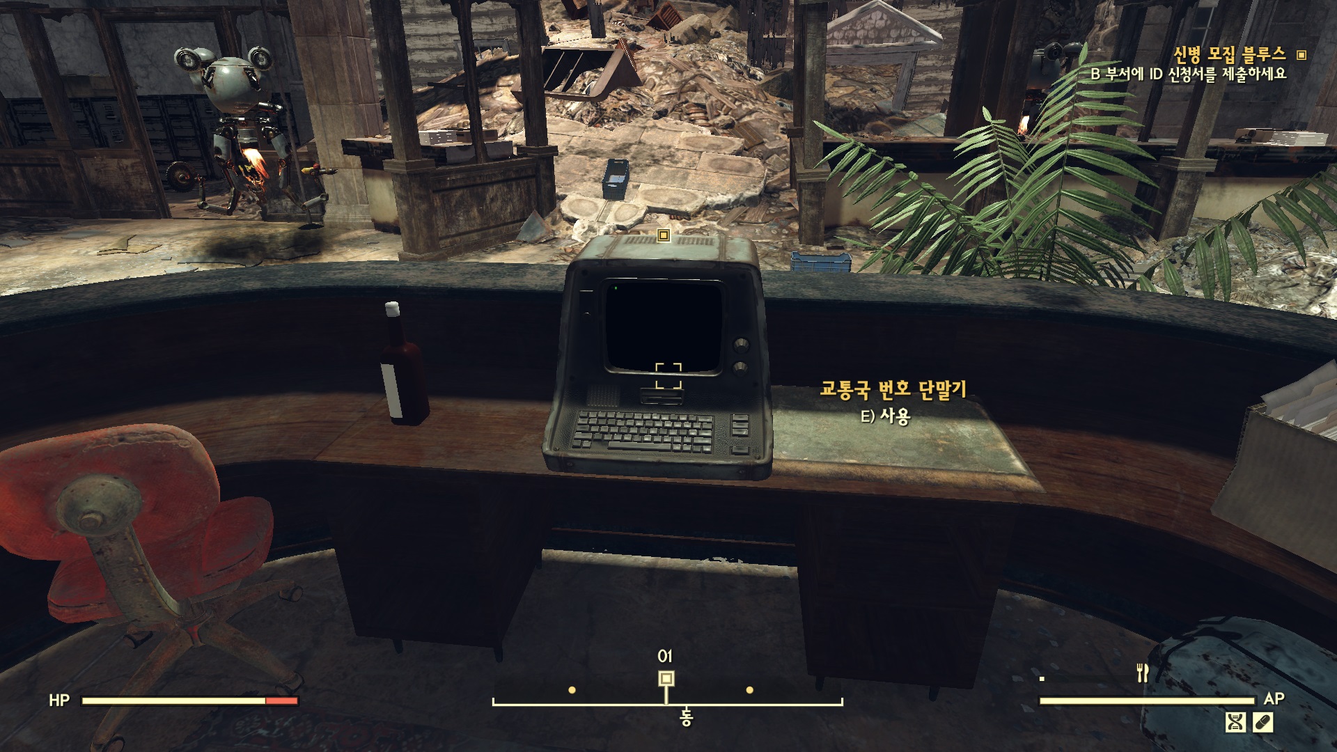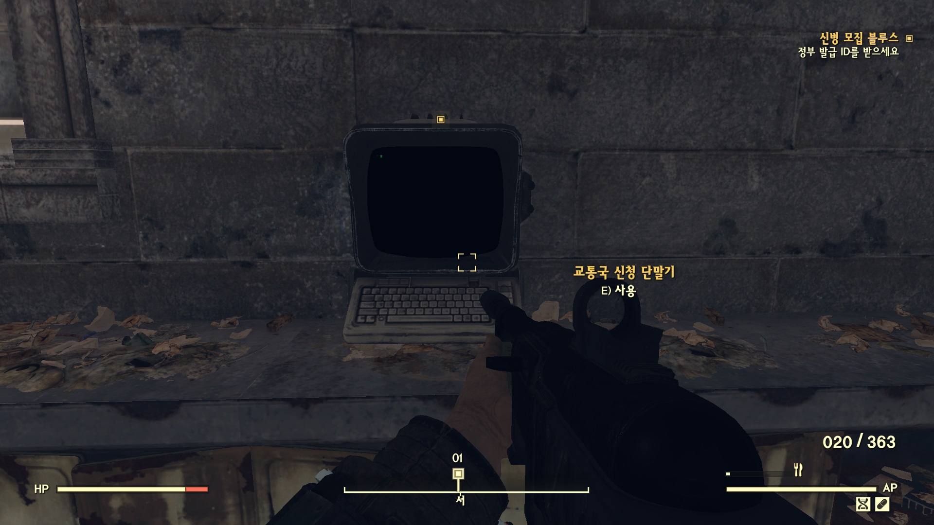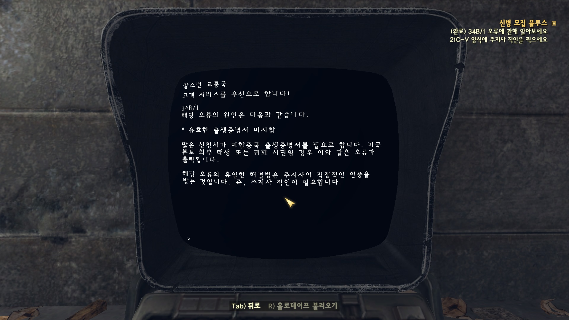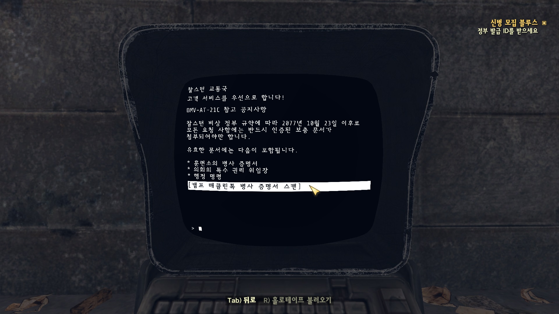 교통국 단말기로 가서 '정부 아이디 신청 (DMV-AT-21C) => 캠프 매클린톡 병사 증명서 스캔'을 선택한다. 그럼 뒤에 또 몇가지 선택하는게 나오는데 뭘 선택해도 상관없다.