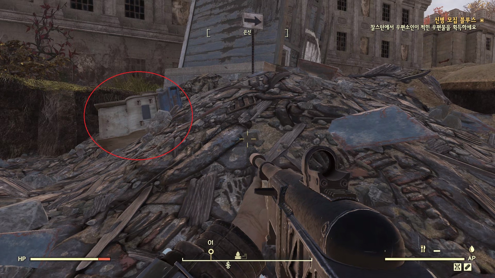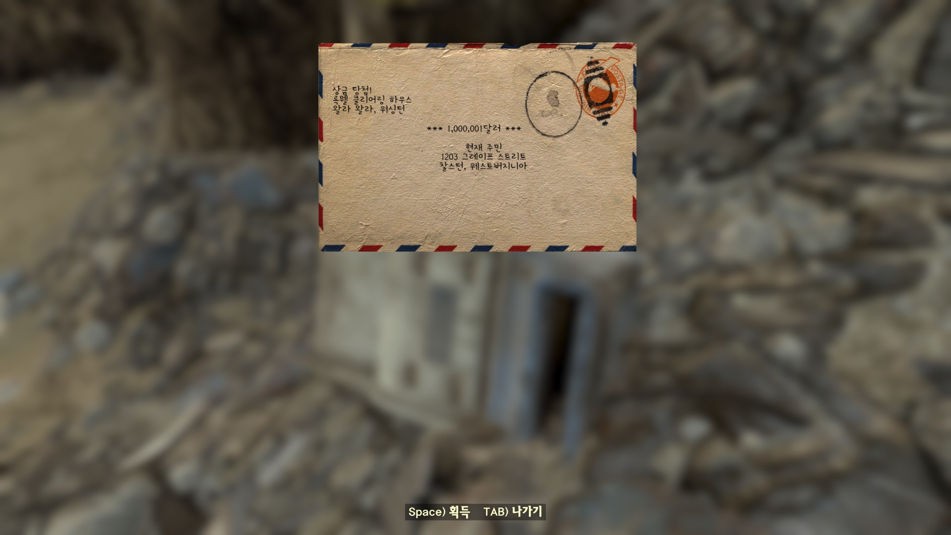 건물 밖을 나와 직진 후 나무 계단에서 우측으로 가다보면 화살표 표지판이 있는 곳에서 우체통과 함께 우편물을 하나 발견할 수 있다. 이걸 갖다 주자.