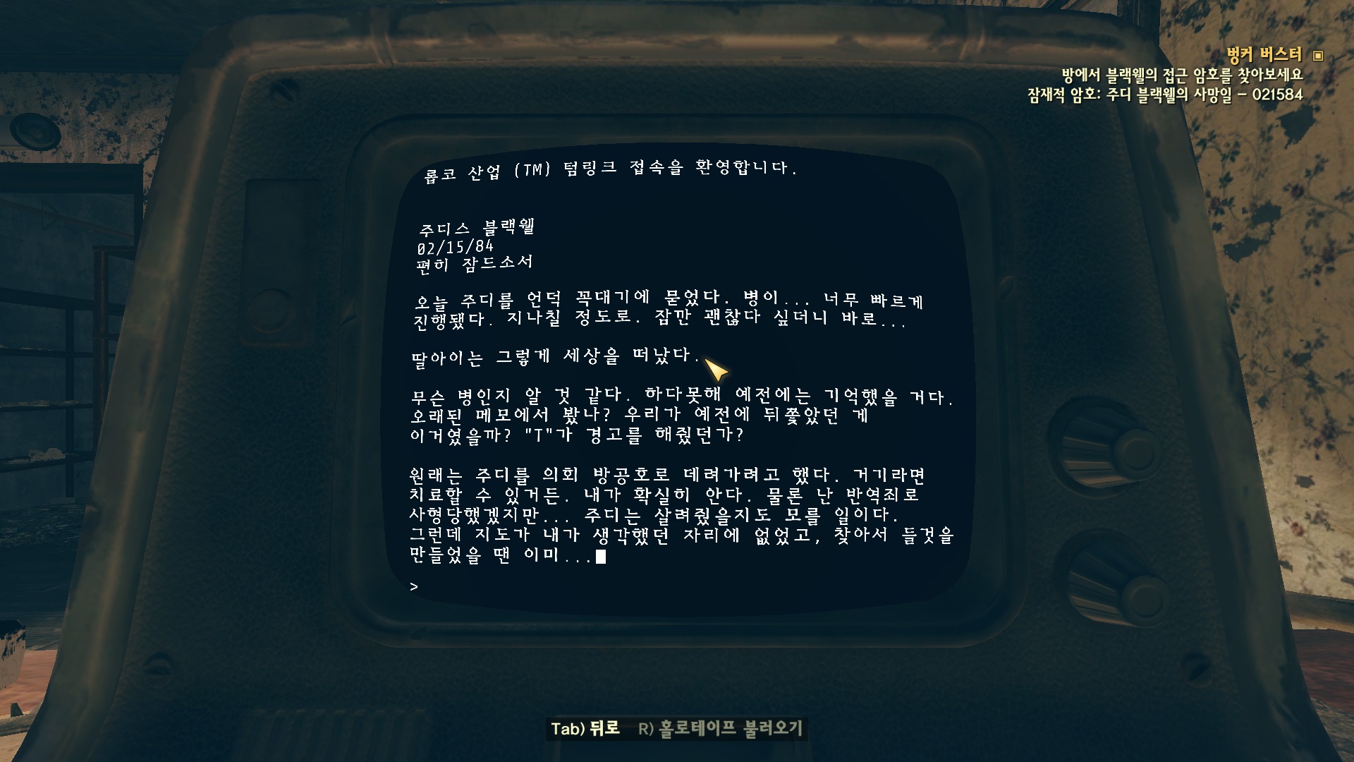 홀로테이프를 재생하면 퀘스트가 완료 되고 '우리 중 하나 (One of Us)'로 이어진다.